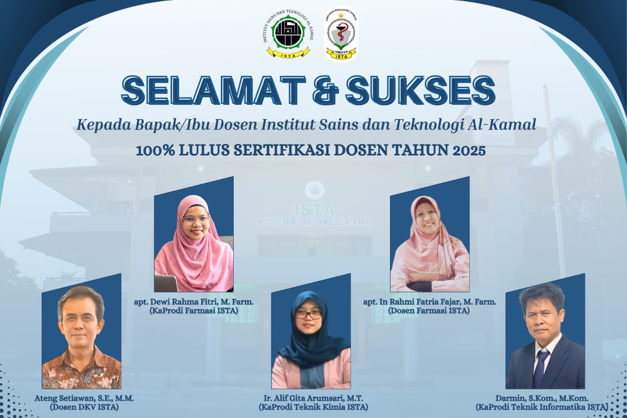“Prestasi kelulusan sertifikasi dosen ini tidak hanya milik diri sendiri, tetapi juga civitas akademi Institut Sains dan Teknologi Al Kamal ( ISTA ) juga masyarakat yang akan mendapatkan manfaat dari peningkatan kualitas pendidikan tinggi.