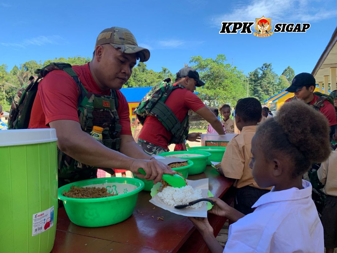 Salah seorang siswa, Yulius (9), mengungkapkan kegembiraannya, “Terima kasih, Pak Tentara! Makanannya enak sekali, saya senang bisa makan siang dengan teman-teman!”