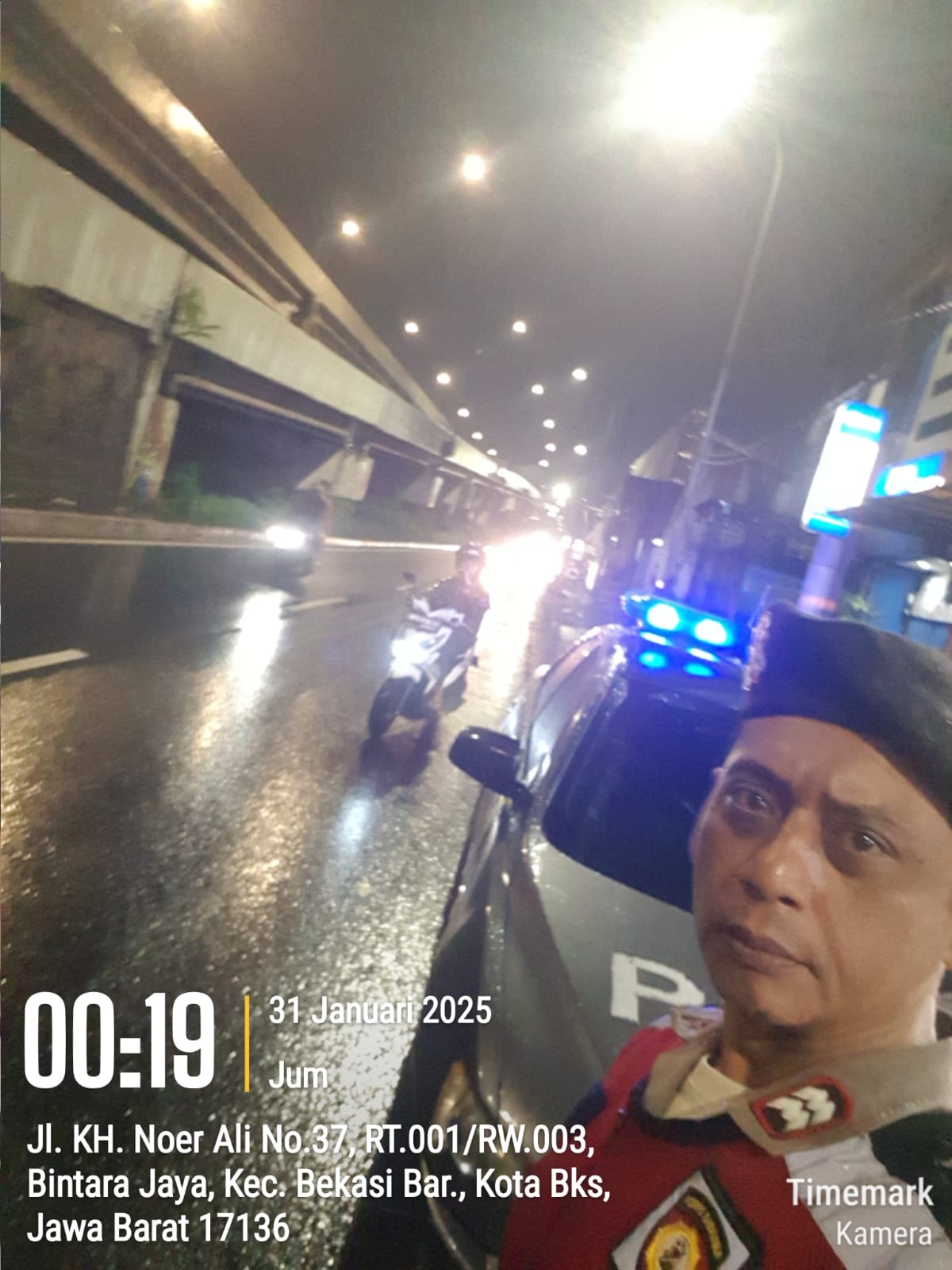 Giat patroli ke lokasi-lokasi dan pada jam rawan guna mencegah terjadinya tindak pidana dan tawuran di wilayah hukum Polsek Bekasi Barat. Piket malam ini route patroli mulai dari Jl. Jenderal Sudirman – Jl. Sultan Agung, – Jl. I Gusti Ngurah Rai – Jl. pemuda – Jl. Bintara Jaya – Jl. KH. Noer Ali – Jl. Raya Patriot – Perumnas I – kembali ke Mako Polsek.Kamis.(30/1-2025).Malam.