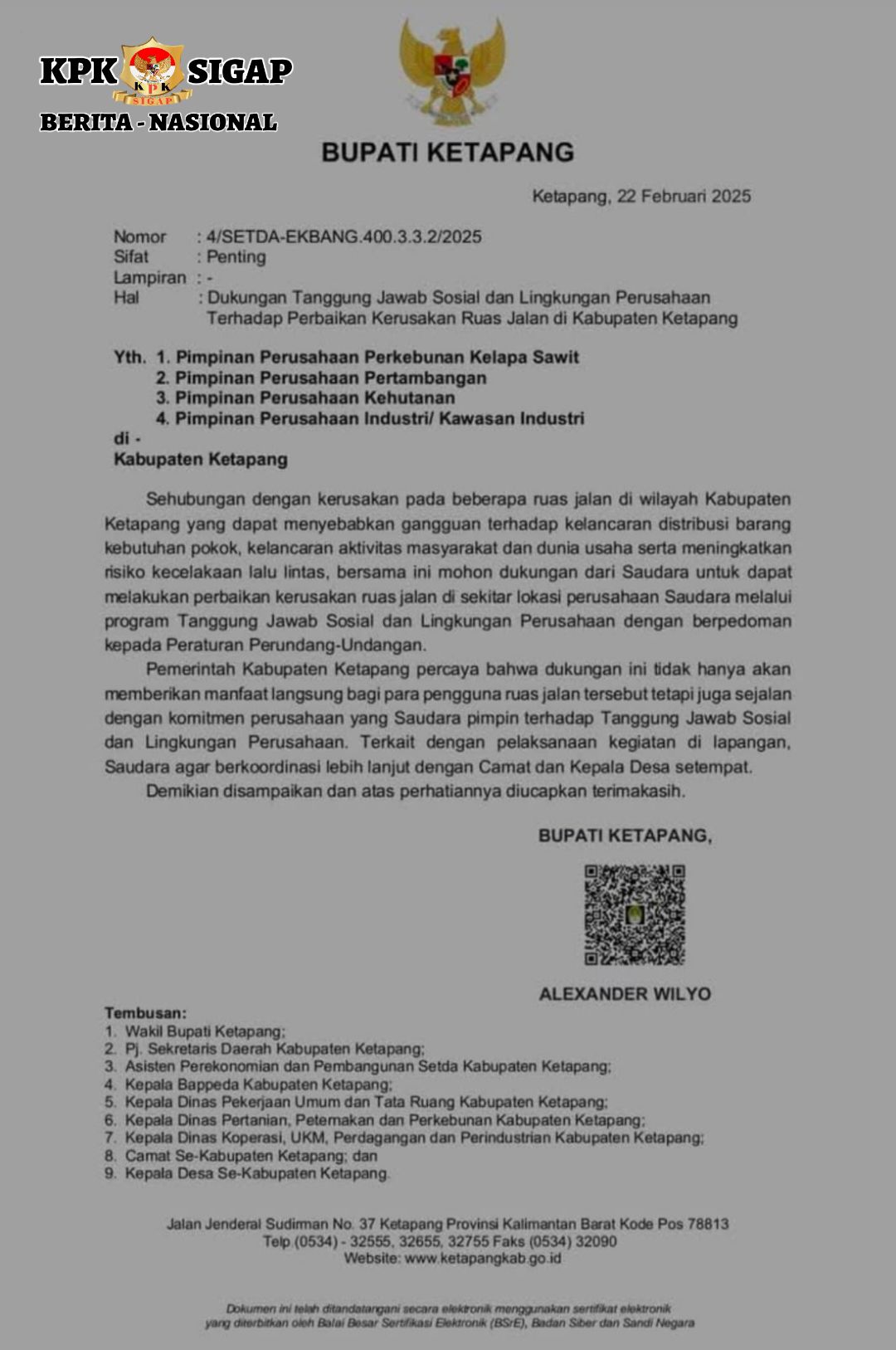 Salah satu organisasi Perkumpulan Wartawan Kalimantan Barat, menyambut positif langkah dan kebijakan Bupati yang telah menyurati perusahaan yang ada di wilayah Kabupaten Ketapang guna membantu perbaikan ruas jalan yang sudah rusak berat.