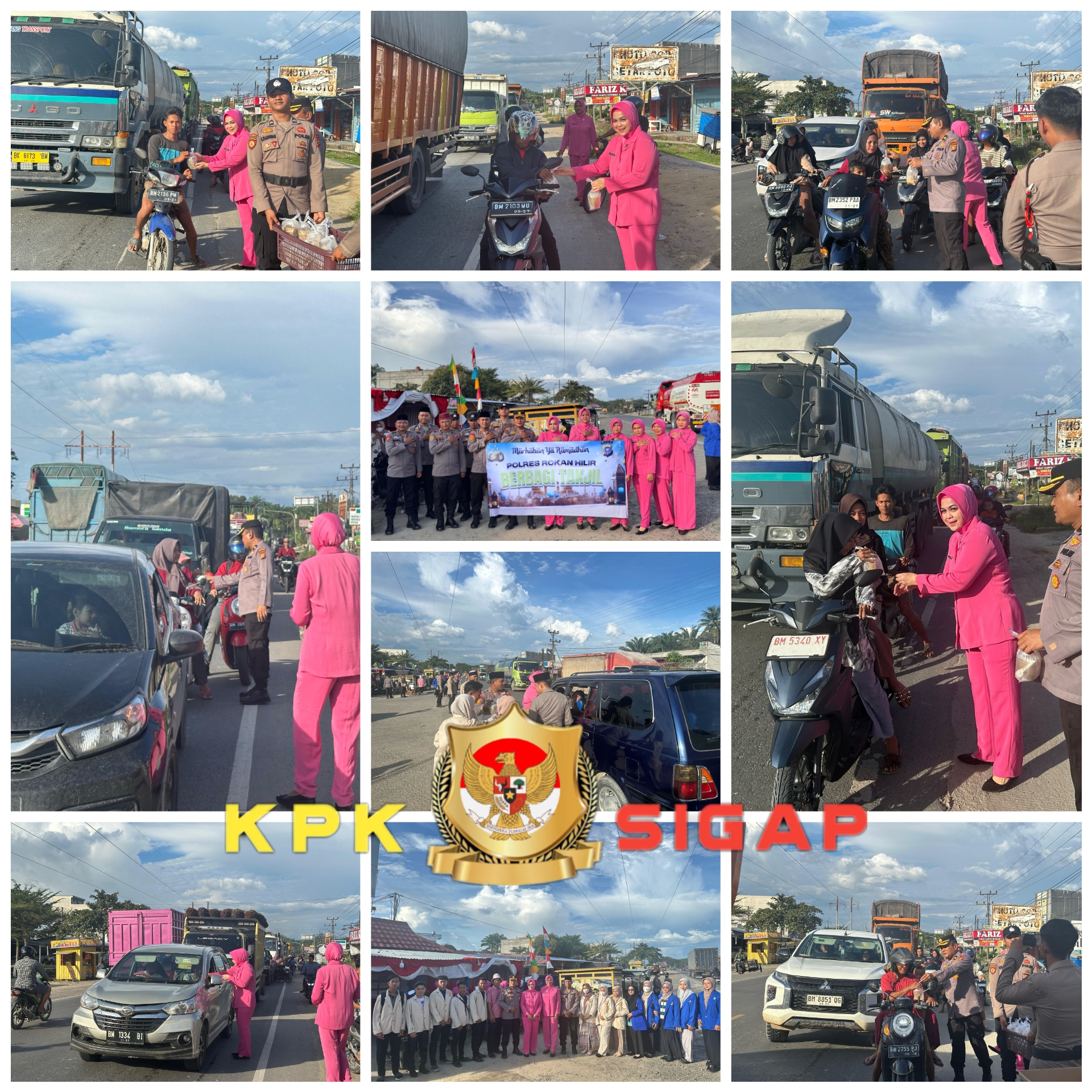 Beberapa Personel Polres Rohil membagikan takjil Ramadhan kepada masyarakat yang melintas di jalan lintas Sumatera di daerah Simpang Benar Kelurahan Cempedak Rahuk Kecamatan Tanah Putih Kabupaten Rokan Hilir. Sabtu 08 Maret 2025 sekira pukul 17.00 WIB.