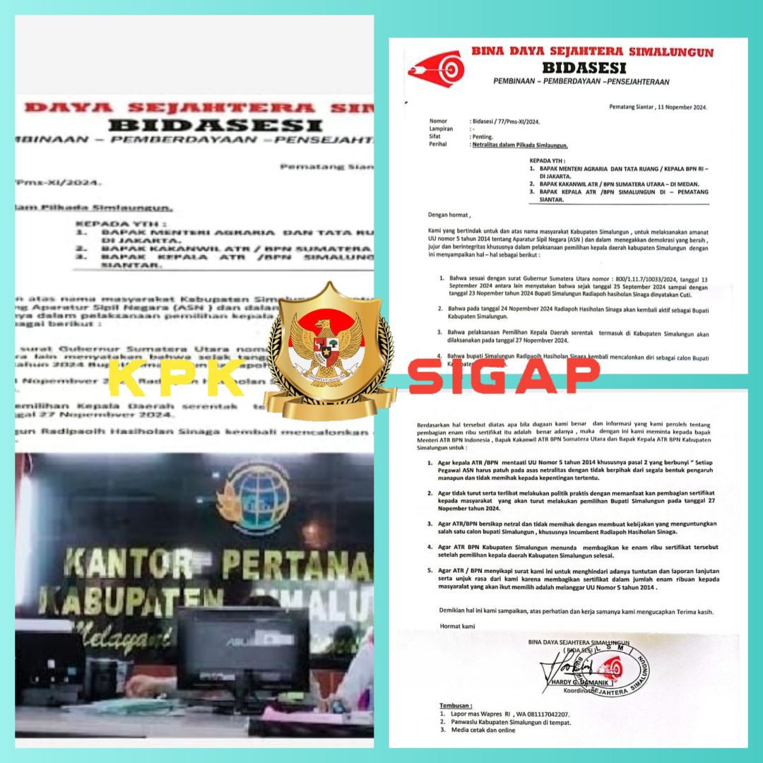 Simalungun – kpksigap.com Masyarakat Simalungun yang tergabung dalam Bidasesi (Bina Daya Sejahtera Simalungun) meyurati Mentri Agraria dan tata ruang, kepala BPN RI, Kakanwil ATR/BPN Sumut di Medan, dan kepala ATR/BPR Simalungun agar bertindak Netralitas dalam Pilkada Simalungun sebagaimana dalam amanat UU nomor 5 tahun 2014 tentang Aparatur Sipil Negara (ASN )