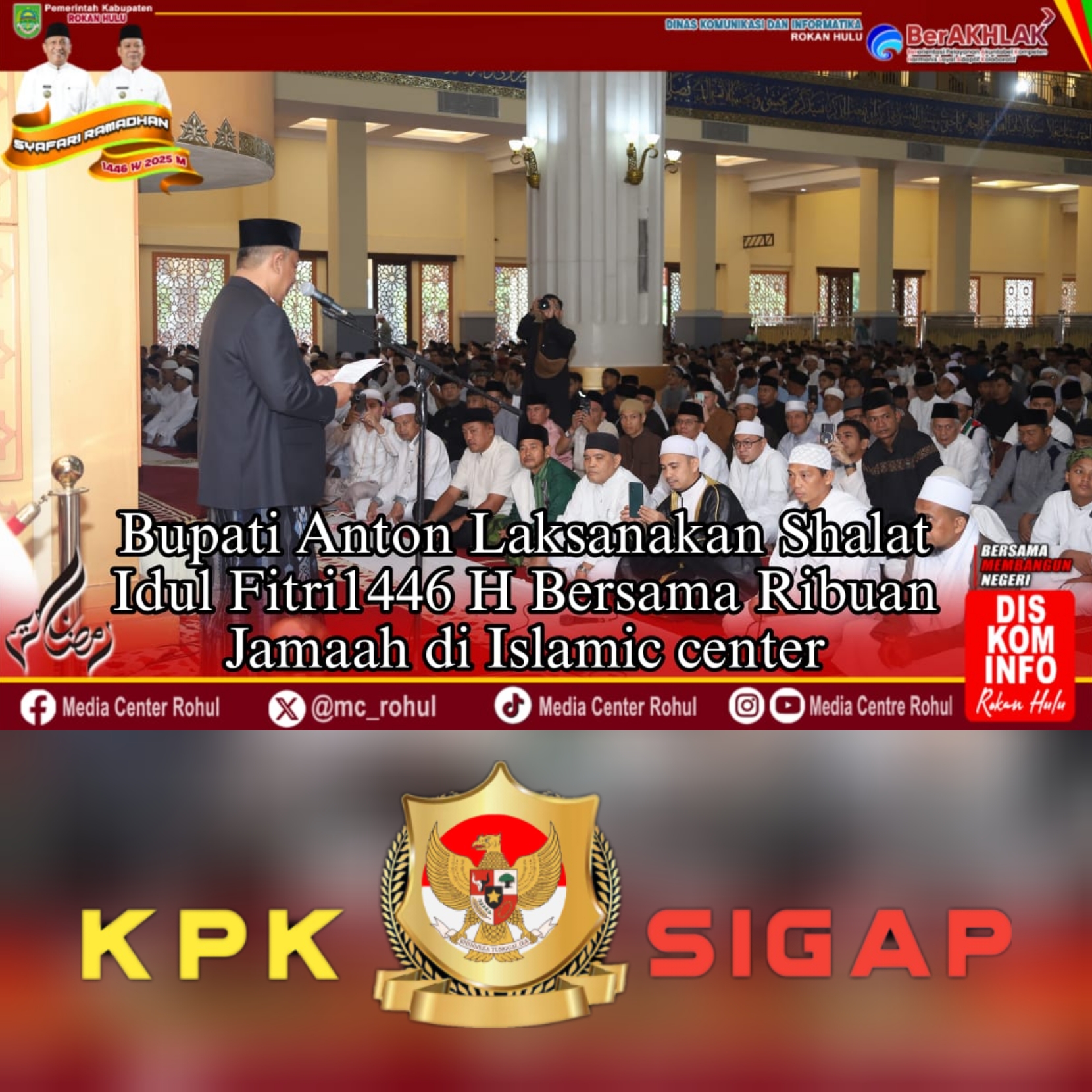 ROHUL, kpksigap.com – Bupati Rokan Hulu, Anton, ST, MM dan Wakil Bupati Rokan Hulu H. Syafaruddin Poti, SH, MM melaksanakan Shalat Idul Fitri 1446 H bersama Ribuan Jamaah di Islamic Center Rokan Hulu, Senin (31/03/2025).
