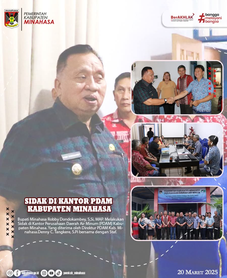 Dalam upaya memastikan pelayanan publik berjalan optimal dan profesional, Bupati Minahasa, Robby Dondokambey, S.Si., M.A.P., melakukan inspeksi mendadak (sidak) ke Kantor Perusahaan Daerah Air Minum (PDAM) Kabupaten Minahasa.