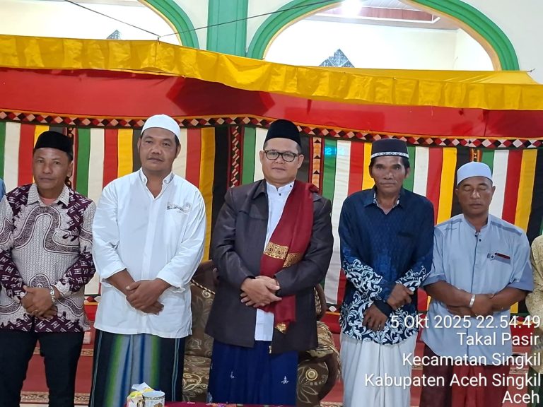 Singkil – KPKsigap.com, Dalam semangat memperingati Maulid Nabi Muhammad SAW 1447 Hijriah, Pemerintah Desa (Pemdes) Takal Pasir bersama seluruh lapisan masyarakat menggelar acara keagamaan yang berlangsung khidmat di Masjid Nur Iman, Minggu malam, 5 Oktober 2025.