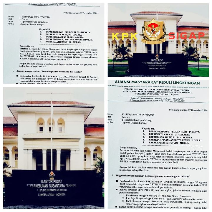 Kordinator Umum FPW Jan Rusdin Sinaga dalam penjelasan nya kepada awak Media ini 16/12 telah menyampaikan surat kepada Presiden Prabowo dan Ketua KPK dan Kejagung RI,DPR RI komisi III dan tembusan nya surat Nomor KLLH/1/lap-PTPN IV Medan