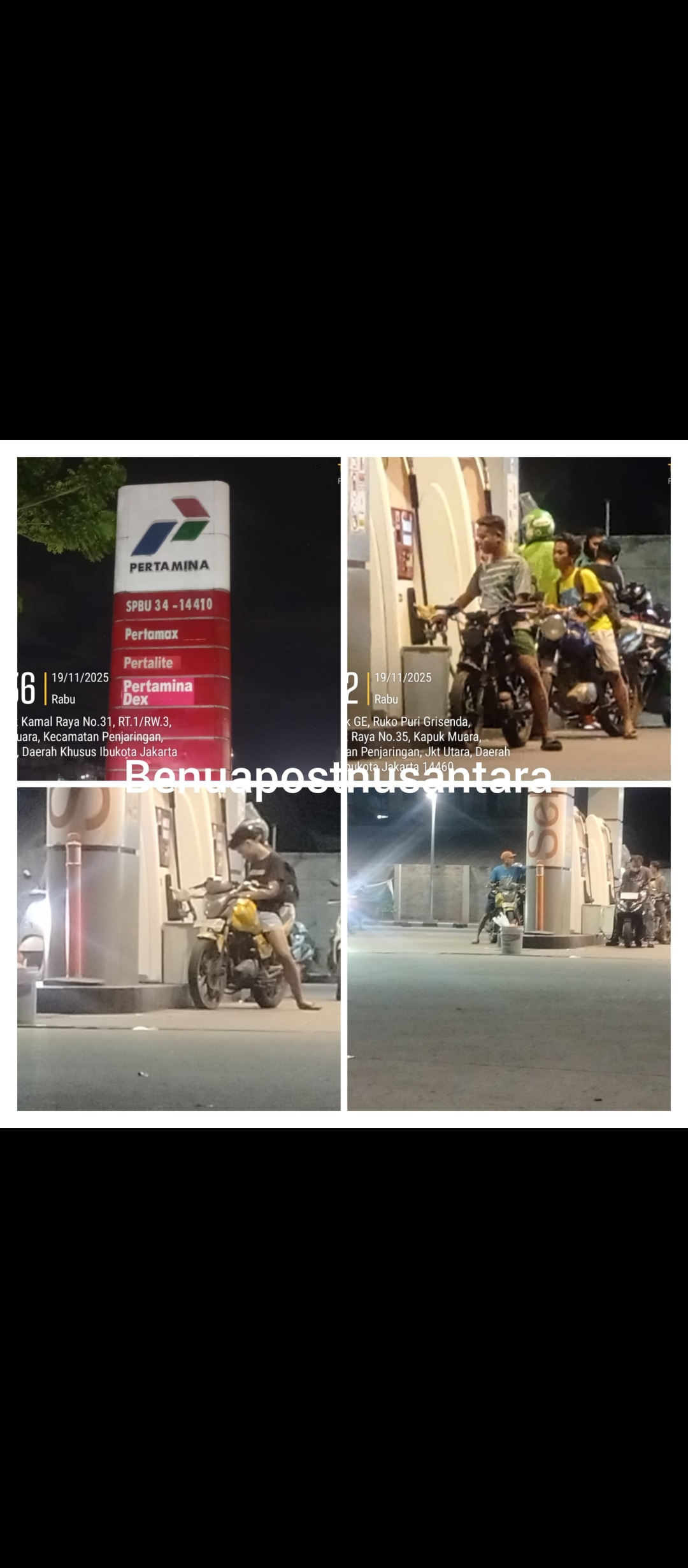 “Aktivitas mencurigakan terkait pembelian BBM subsidi jenis Pertalite terpantau di SPBU 34-14410 yang beralamat di Jalan Kapuk Kamal Raya No. 31, RT 01 RW 03, Kamal Muara, Kecamatan Penjaringan, Jakarta Utara. Dari hasil pemantauan lapangan dan rekaman foto pada malam hari, terlihat sejumlah pengendara sepeda motor melakukan pembelian secara berulang kali (bolak-balik), yang mengarah pada dugaan praktik penimbunan BBM subsidi.