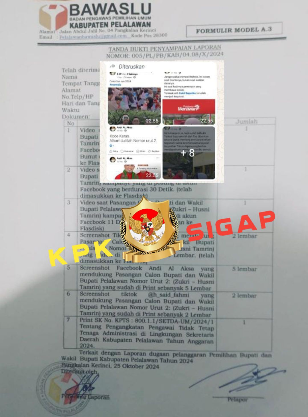 Laporan dugaan pelanggaran netralitas oleh oknum honorer di Setda Pelalawan inisial (SF) dan tenaga pendamping desa inisial (AA) pun telah dilayangkan kepada Bawaslu oleh salah satu warga, inisial J pada Jumat (25/10/2024)