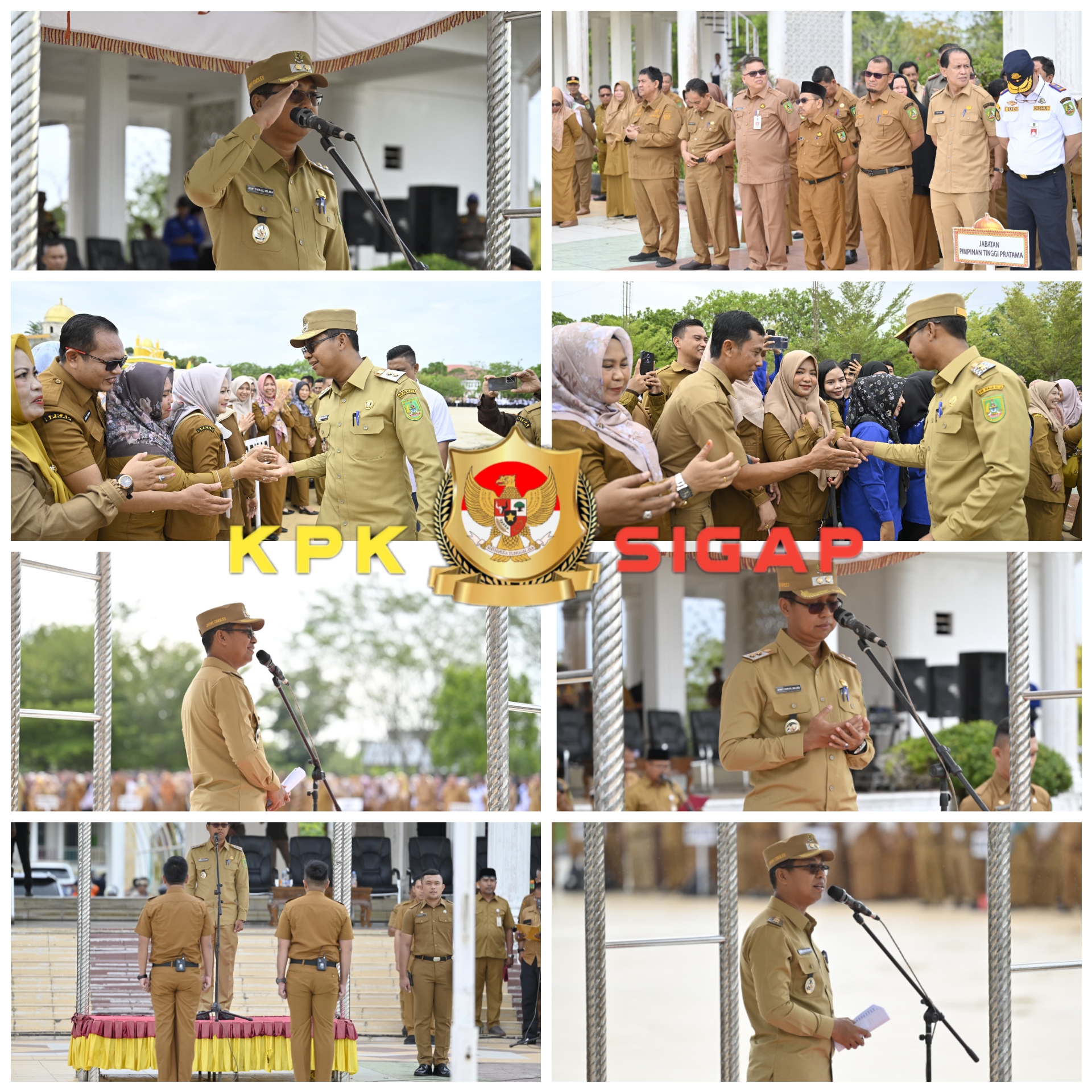 Hari pertama masuk kerja, Wakil Bupati Rokan Hilir (Rohil) Jhony Charles pimpin apel bersama yang dihadiri seluruh Kepala Organisasi Perangkat Daerah (OPD), Camat, Lurah dan perwakilan Guru di lingkungan Pemerintah Kabupaten Rohil, Senin (24/2/2025) di lapangan Taman Budaya Batu Enam Bagansiapiapi Rohil Provinsi Riau.