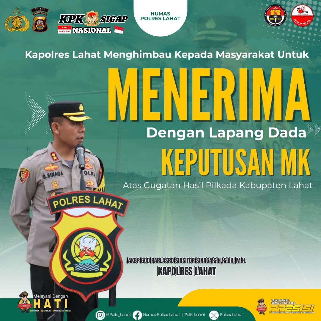 Masyarakat Kabupaten Lahat diimbau untuk tetap tenang dan menghormati proses hukum yang sedang berlangsung. Aparat juga mengingatkan agar tidak mudah terprovokasi oleh berita yang belum tentu benar, serta menunggu hasil keputusan MK dengan sikap yang dewasa dan tertib.
