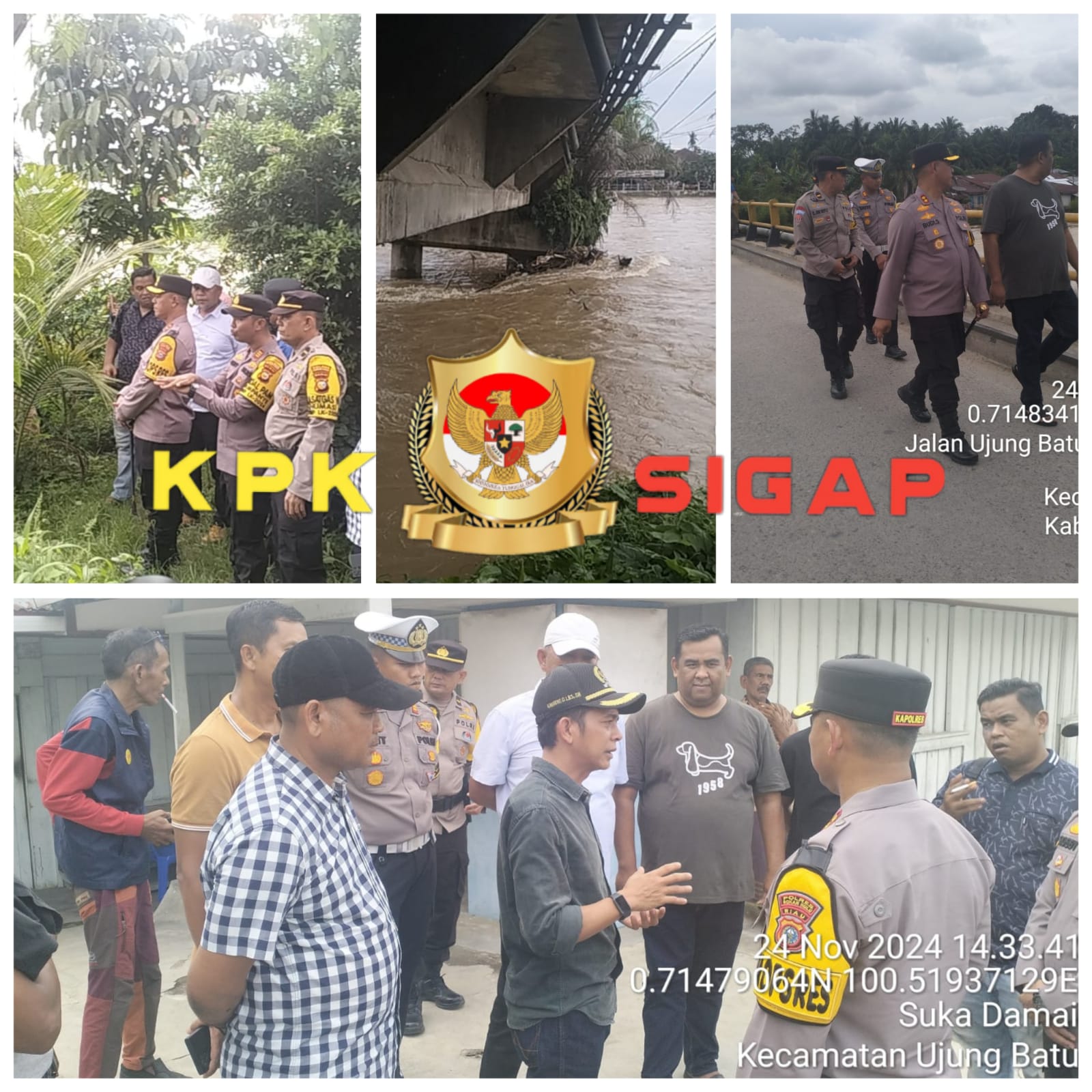 Minggu pagi, 24/11/2024 terpantau kendaraan yang melintasi jembatan hanya satu arah, dimana Personil Polsek Ujungbatu bersama pemuda setempat berperan mengatur lalu lintas, ternyata disisi hulu Jembatan, tepatnya salah satu tiang penyangga Jembatan pada posisi miring, sehingga lantai Jembatan tampak posisi miring.