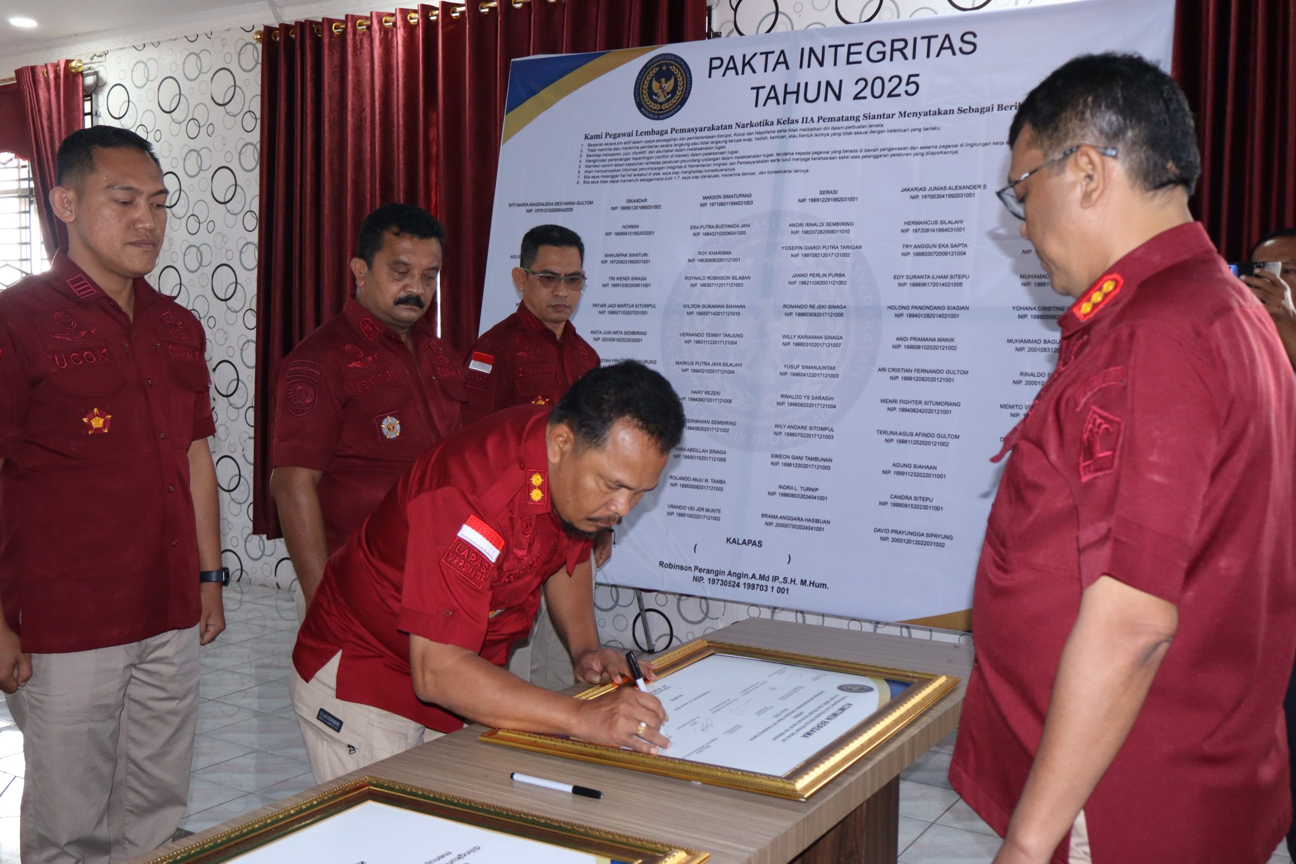 Kpksigap.com // SIMALUNGUN – Kepala Lembaga Pemasyarakatan Narkotika Kelas IIA Pematangsiantar beserta jajaran melaksanakan upacara penandatanganan Pakta Integritas dan Komitmen Bersama Pembangunan Zona Integritas Menuju Wilayah Bebas dari Korupsi (WBK) dan Wilayah Birokrasi Bersih dan Melayani (WBBM). Upacara tersebut dilaksanakan pada hari Kamis (23/01/2025) pukul 10.00 Wib. Kegiatan dilaksanakan di gedung aula Lapas Narkotika Kelas IIA Pematangsiantar di Pamatang Raya, Kabupaten Simalungun. Kegiatan tersebut dilaksanakan atas dasar perintah dari Kementerian Imigrasi dan Pemasyarakatan.