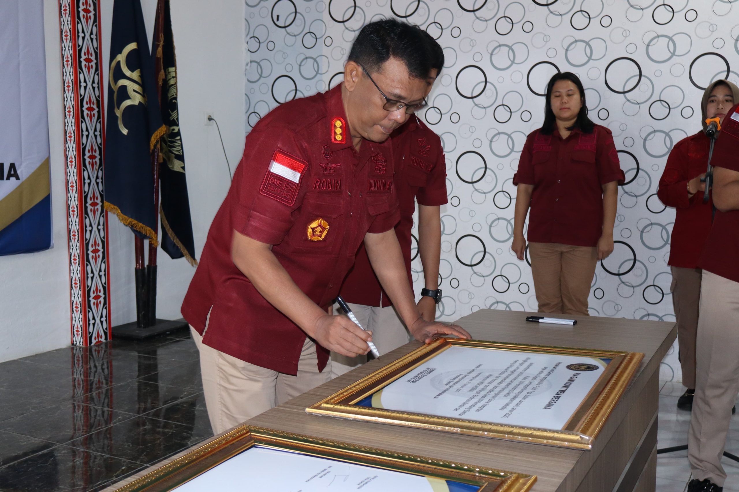Bertindak sebagai inspektur upacara Kalapas Robinson Peranginangin. Beliau mengingatkan jajaran agar mematuhi Pakta Integritas dan Komitmen Bersama tersebut.