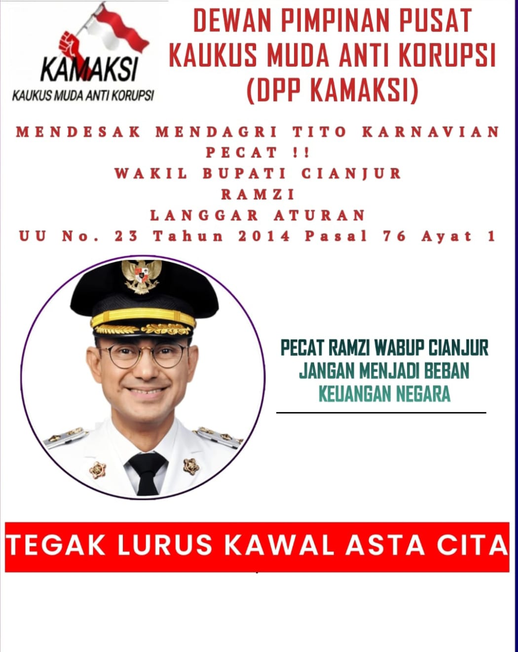 Kaukus Muda Anti Korupsi (KAMAKSI) mendesak Menteri Dalam Negeri (Mendagri) Tito Karnavian untuk memberikan sanksi tegas hingga pemecatan terhadap Wakil Bupati Cianjur, Ramzi, yang dinilai tidak fokus menjalankan tugas sebagai pejabat publik.Jakarta (23/6/2025).