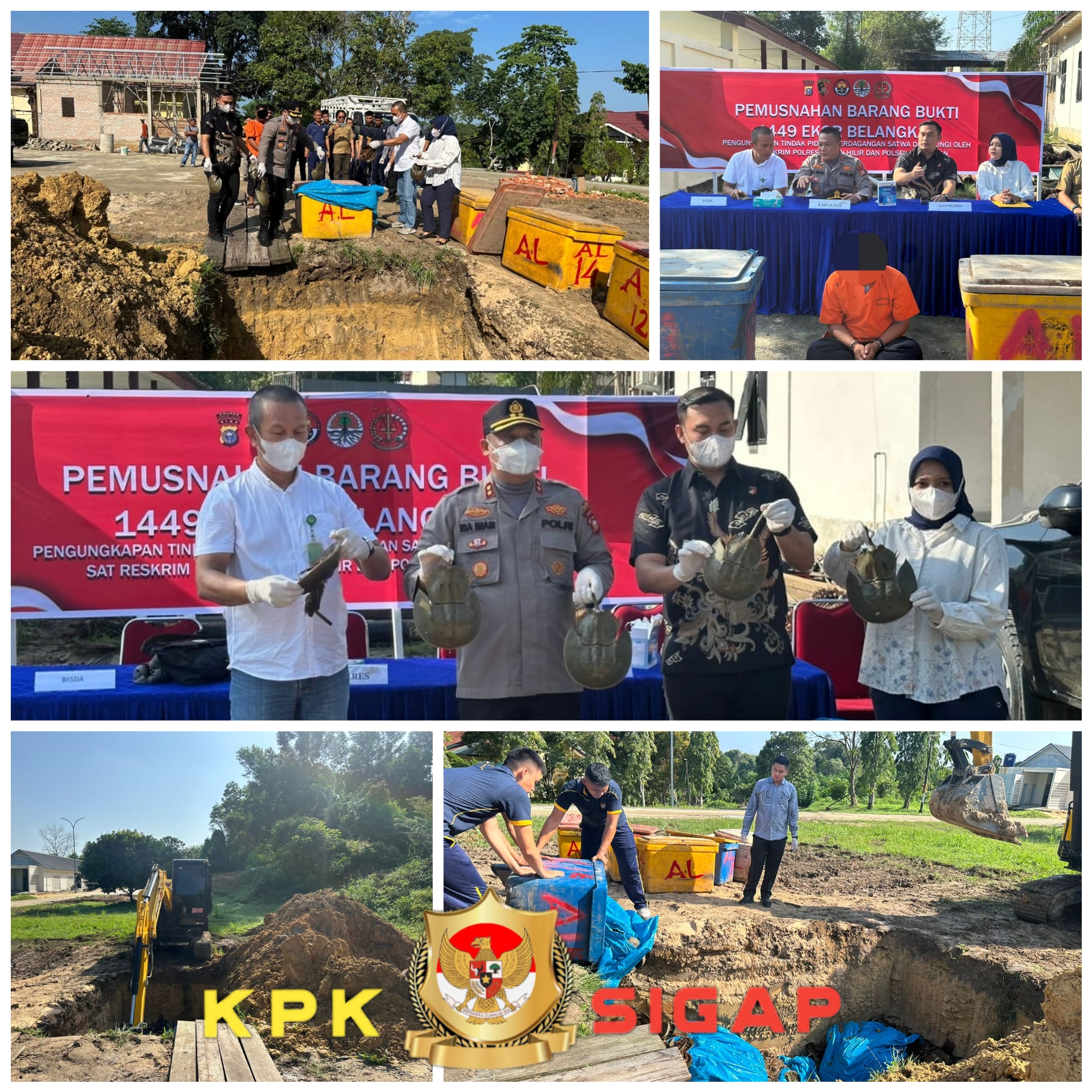 Didampingi, Kasat Reskrim Rohil AKP I Putu Adi Juniwinata,S.Tr.K.,S.I.K.,M.Si, KBO Sat Reskrim Polres Rohil Iptu Yohanes Untung Sormin, S.H. Kasi Humas Polres Rohil Ipda Dahri Iskandar Lubis, BKSDA Kabupaten Rohil Muslino, S.Si dan Rahmat Dani, S.Hut, serta tersangka pelaku US Trg. Sebanyak 1449 ekor Belangkas dimusnahkan dengan ditanam kedalam tanah.