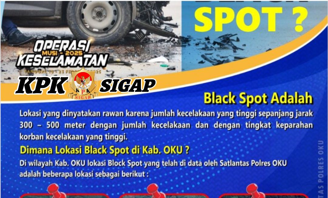 Kini kalimat Black Spot yang masih asing ditelinga masyarakat, Apa itu Black Spot, ini penjelasan Kasat Lantas Polres Oku Akp Fausiah Tamal, S.T.K., S.I.K., beliau menjelaskan bahwa kalimat Black Spot adalah Lokasi yang dinyatakan rawan karena jumlah kecelakaaan yang tinggi sepanjang jarak 300-500 Meter dengan jumlah kecelakaan dan dengan tingkat keparahan korban kecelakaan tinggi.
