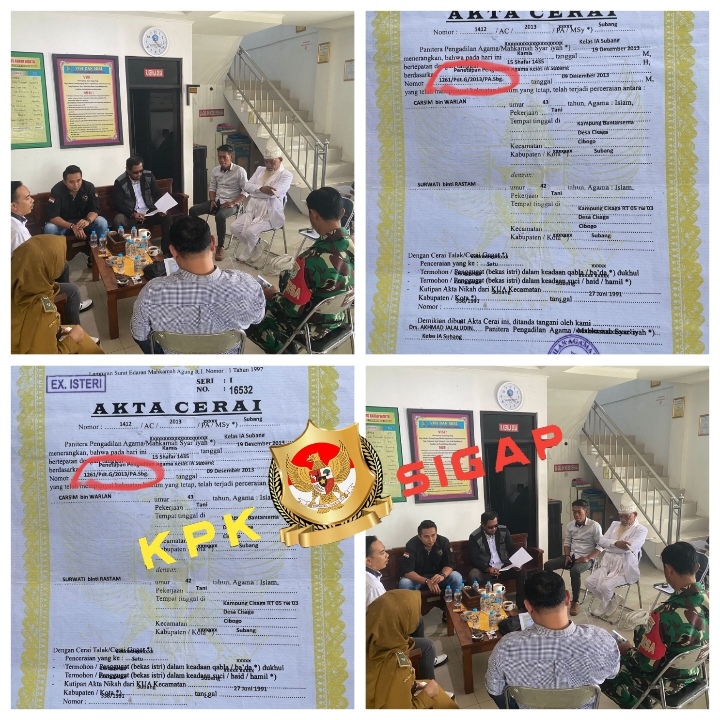 Ia berharap pihak KUA Cibogo memberikan saksi tegas kepada oknum amil Desa cisaga yang mengurus akte cerai tersebut, Dirinya akan terus mengawal proses hukum dugaan pemalsuan akta cerai palsu tersebut akan di tindaklanjuti dengan Pelaporan ke APH Kapolres Subang oleh Kuasa Hukum LSM Pendekar Subang Yang Mulia Bpk Irwan Yustiarta SH dan Bpk Saepulloh SH,.