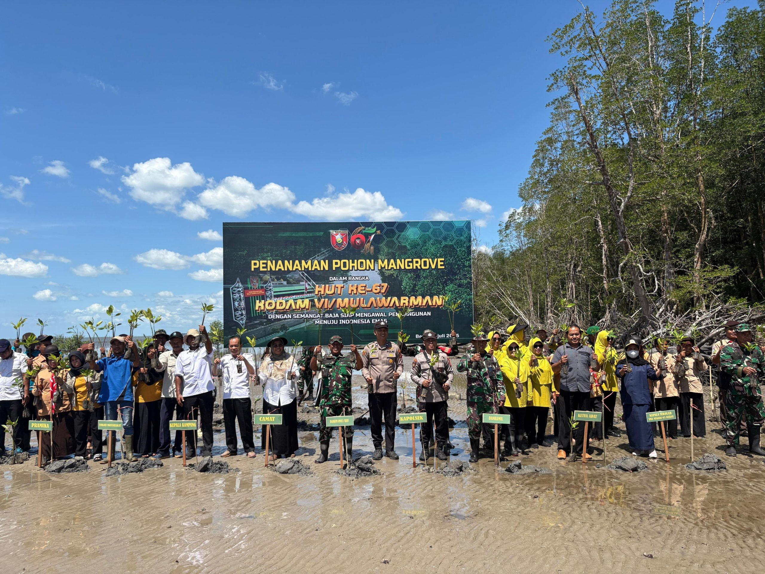 Aipda Yuda Satria, SH.-Ps. Kanit Intelkam yang mewakil Kapolsek Talisayan menyampaikan, Pertama-tama kita bersyukur kepada Tuhan yang maha kuasa , telah diberi kekuatan, kesehatan kesempatan sehingga kita bisa hadir Dalam Rangka penanaman pohon Mangrove di Pantai Kampung Dumaring memperingati Hut KODAM VI/Mulawarman Ke-67,