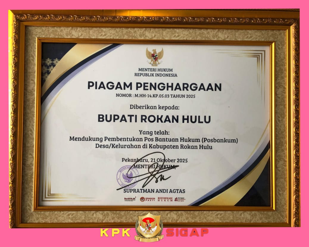 Penghargaan tersebut diserahkan secara resmi pada acara Peresmian Pos Bantuan Hukum dan Penandatanganan Perjanjian Kerjasama yang digelar di Aula Balai Serindit, Gubernuran Riau, dengan dihadiri jajaran pejabat dari Kementerian Hukum dan HAM Republik Indonesia serta berbagai unsur terkait. Selasa (21/10/2025).