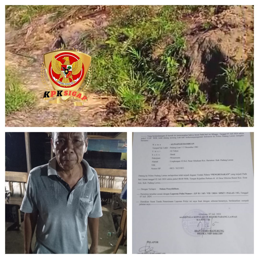 Melihat kondisi pohon sawit yang sudah dirusak itu kemudian pada dini hari Minggu tanggal 7 Juli saya buat laporan pengrusakan ke Polres Padang Lawas dan laporan saya sudah diterima dengan Surat Tanda Penerima Laporan Polisi (STPLP) Nomor : STPLP/B/145/VII/2024/SPKT/PALAS/SU,saya berharap semoga laporan saya cepat di peroses dan pelakunya bisa dihukum.”Harapnya.