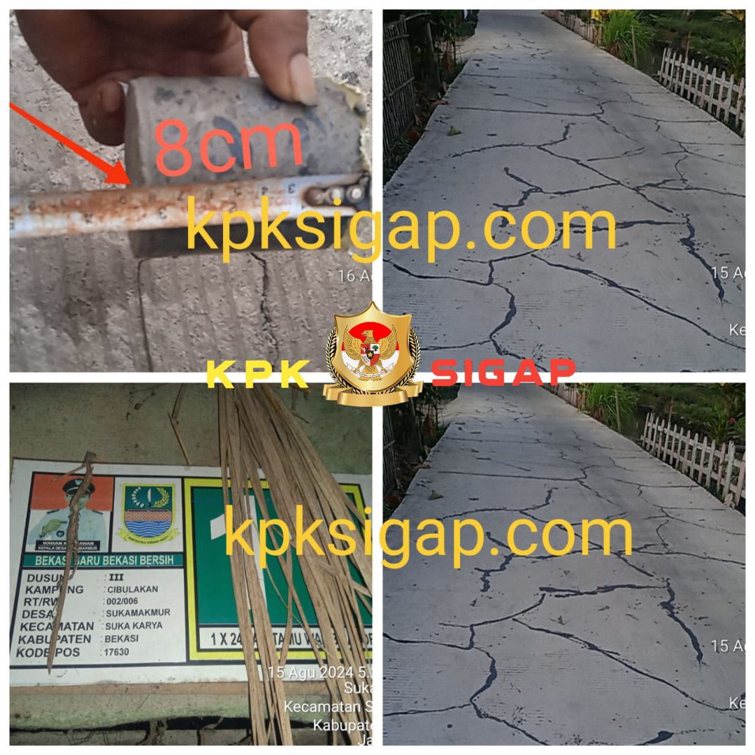 Hal Tersebut membuat DPD LSM Prabhu Indonesia Jaya kabupaten Bekasi geram, aneh standarnya 15 cm kenapa pas di lakukan pengambilan sampel Core Dill hanya rata-ratanya 13 cm, di tambah kualitas betonnya sangat buruk, bisa kita lihat di lokasi peningkatan jalan lingkungan Haji Bonin Desa Sukamakmur, hasilnya buruk seperti peta harta Karun, ucap aweng sekjen DPD LSM Prabhu Indonesia Jaya Kabupaten Bekasi.