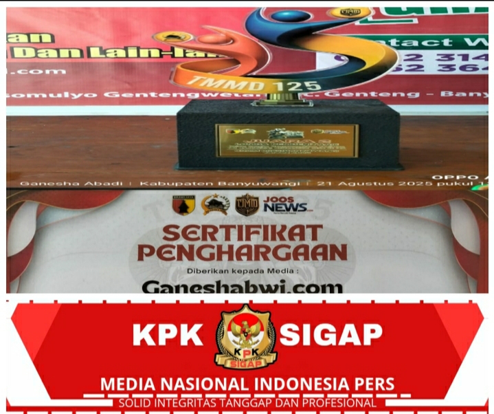 Banyuwangi, 21 Agustus 2025 – Media Nasional GaneshaBWI.com berhasil meraih predikat prestasi membanggakan dengan menyabet Juara 2 dalam ajang Lomba Pemberitaan TMMD (TNI Manunggal Membangun Desa) Ke-125, yang diselenggarakan oleh Kodim 0825 Banyuwangi.