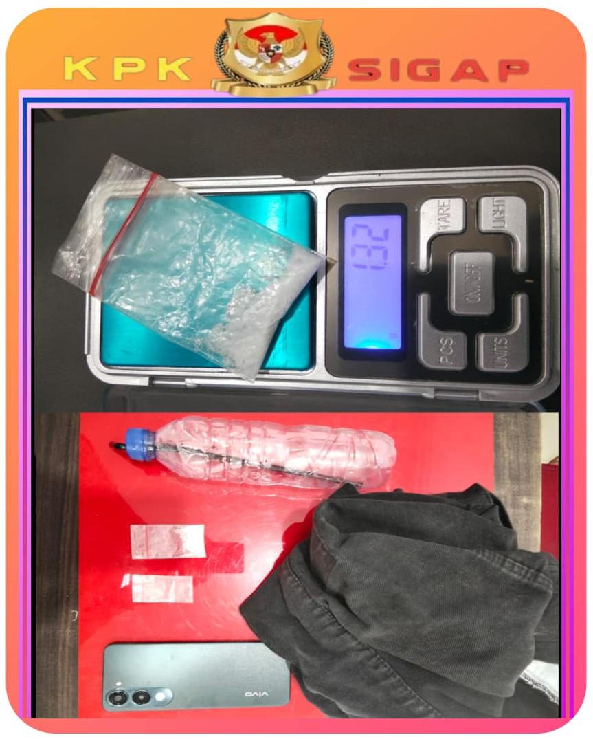 Dari hasil penggeledahan, petugas menemukan barang bukti berupa satu paket narkotika jenis sabu dengan berat kotor 1,32 gram yang dibungkus plastik klip bening, satu plastik klip kosong, satu alat hisap (bong) dari botol plastik, satu helai jaket hitam, serta satu unit handphone android.