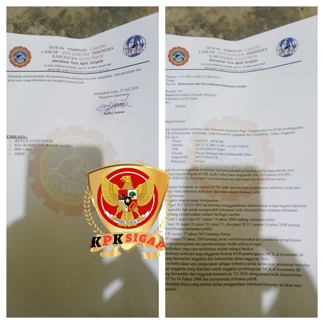 Aceh Timur .— kpksigap.com-Ormas LAKI (Laskar Anti Korupsi Indonesia) aceh timur kecewa tanggapi dinas PUPR aceh timur Permohonan Informasi Publik yang dimohon oleh ormas laskar anti korupsi indonesia dpc aceh timur mengenai Pagu anggaran sumber dari kementrian beserta (Rap ) perencanaan MCK tidak puas jawaban keberatan terhadap permohonan dinas Pupr aceh timur kangkangi undang undang informasi publik Sesuai UU KIP dan Perki 1/2011, keberatan dapat diajukan setelah: