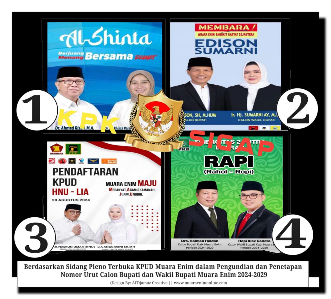 Dalam sidang terbuka yang digelar di hotel Melio kota Muara Enim , KPUD Kabupaten Muara Enim telah menerapkan 4 pasangan dengan nomor urut sebagai peserta Pilbup dan Wabup kabupaten Muara Enim tahun 2024.