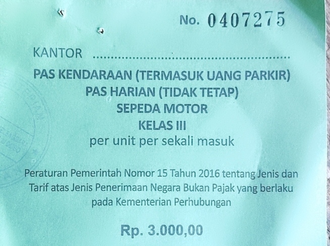 Dan saya membayar karcis masuk pas kenderaan termasuk uang parkir Rp.3.000 dan pembayaran karcis pas Orang sekali masuk Rp 2.000.