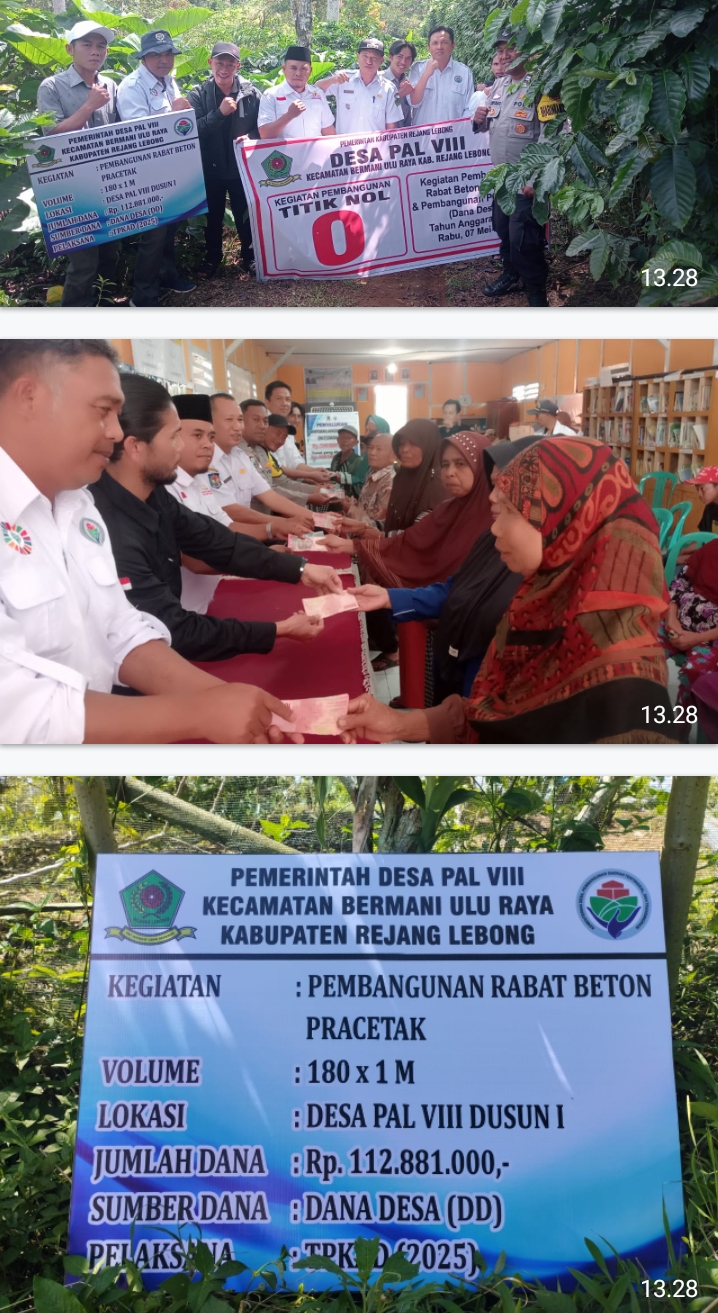 Pemerintah Desa Pal V111(Pal delapan) Kecamatan Bermani Ulu Raya(BUR) Kabupaten Rejang Lebong melakukan titik nol pembangunan jalan rabat beton yang bersumber dari dana desa tahun 2025. Kegiatan berlangsung di desa Pal V111(Pal Delapan) Kecamatan Bermani Ulu Raya(BUR) Kabupaten rejang lebong, Rabu (07/05/2025).