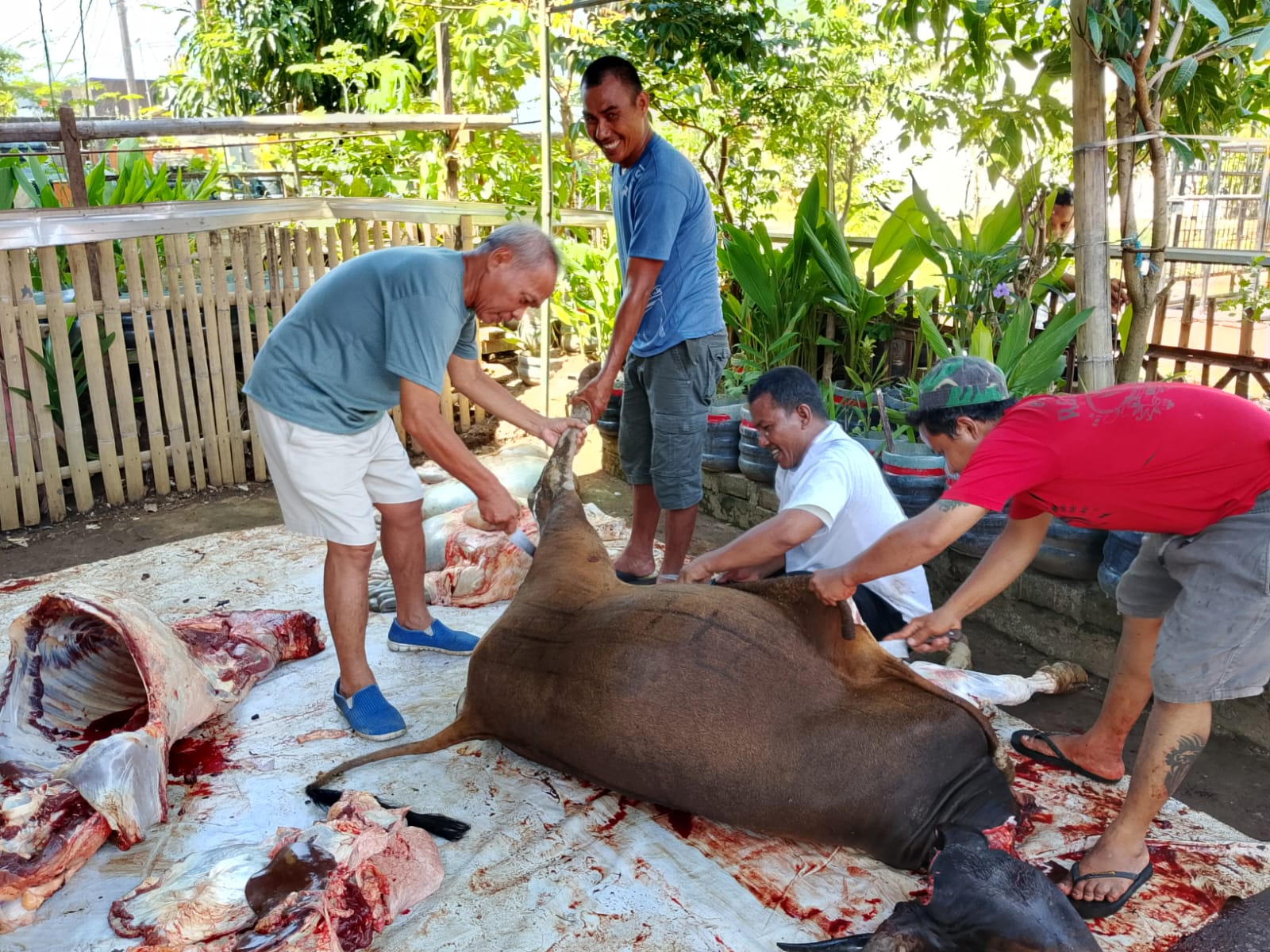 Prosesi pemotongan hewan qurban berlangsung khidmat dan penuh syukur, diiringi gema takbir dari para jamaah pemotongan hewan qurban.