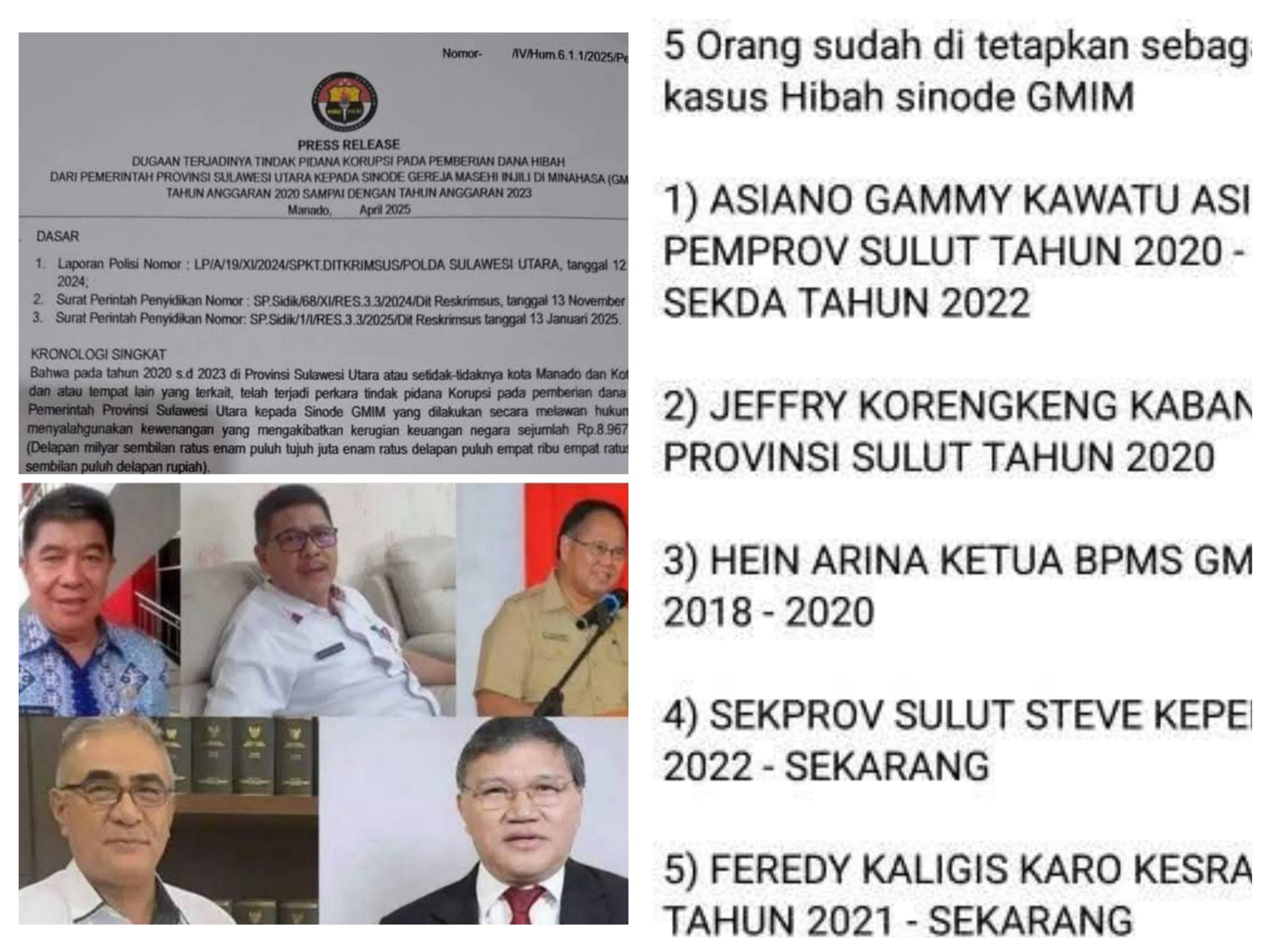 Manado, kpksigap.com, Rabu, 09 April 2025 Direktorat Reserse Kriminal Khusus (Ditreskrimsus) Polda Sulawesi Utara telah menetapkan dan menahan lima orang tersangka dalam dugaan tindak pidana korupsi atas pemberian dana hibah dari Pemerintah Provinsi Sulawesi Utara kepada Sinode Gereja Masehi Injili di Minahasa (GMIM) pada tahun anggaran 2020 hingga 2023.