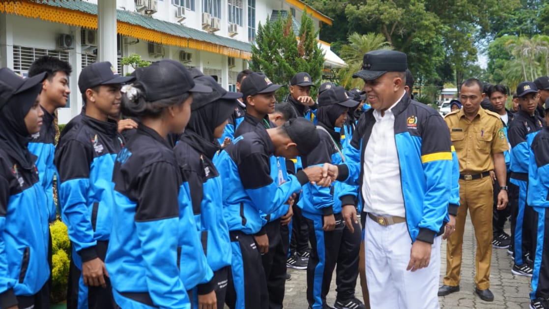 Langkat ( Sumut ) kpksigap.com Pj Bupati Langkat HM Faisal Hasrimy AP MAP didampingi Kadispora Ngaturken PA MPd melepas 76 atlet kontingen Kabupaten Langkat untuk mengikuti Pekan Olahraga Pelajar Provinsi Sumatera Utara (POPPROVSU) di halaman Kantor Bupati Langkat, Senin siang (1/7/2024).