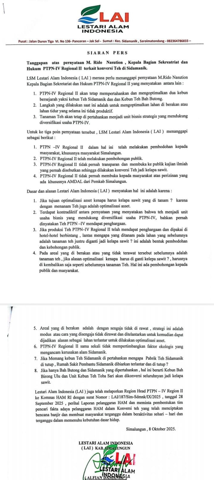 LSM Lestari Alam Indonesia (LAI) Mengatakan PTPN-IV Regional II telah melakukan pembodohan publik Terkait Penanaman Sawit di Sidamanik Simalungun, KPK sigap- Lestari Alam Indonesia (LAI) […]