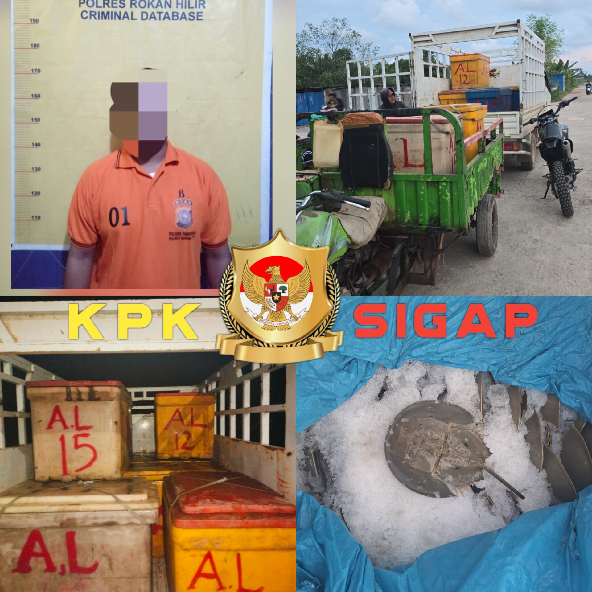 Inisial US Trg ( 30 Tahun ) alamat Jl. Bhakti Mesjid Raya Kelurahan Panipahan Kota Kecamatan Pasir Limau Kapas Kabupaten Rohil Provinsi Riau. Diamankan setelah polisi menerima laporan dari masyarakat tentang adanya kegiatan penangkapan satwa liar di kawasan tersebut. 10 kotak piber yang berisikan Belangkas dan 1 unit kendaraan roda 4 jenis Isuzu Traga warna putih, turut diamankan untuk barang bukti.