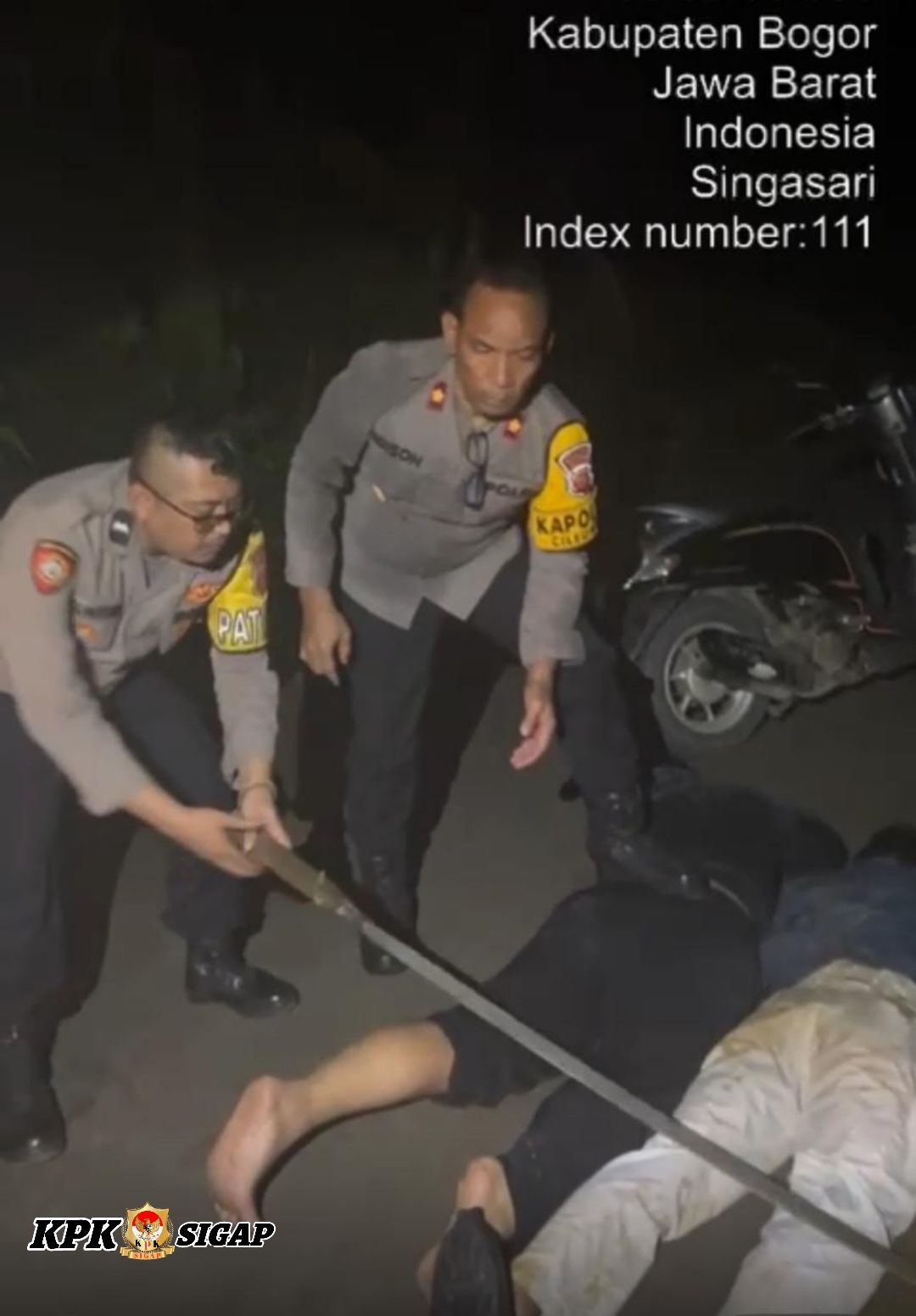 Tak lama berselang, dua sepeda motor yang ditumpangi enam orang melintas, salah satu di antaranya membawa senjata tajam jenis celurit panjang. Kapolsek beserta tim langsung melakukan pengejaran hingga akhirnya para pelaku terjatuh di area persawahan Kampung Ciukuy, Desa Singasari, Jonggol. Mereka kemudian diamankan dan dibawa ke Polsek Cileungsi untuk pemeriksaan lebih lanjut.