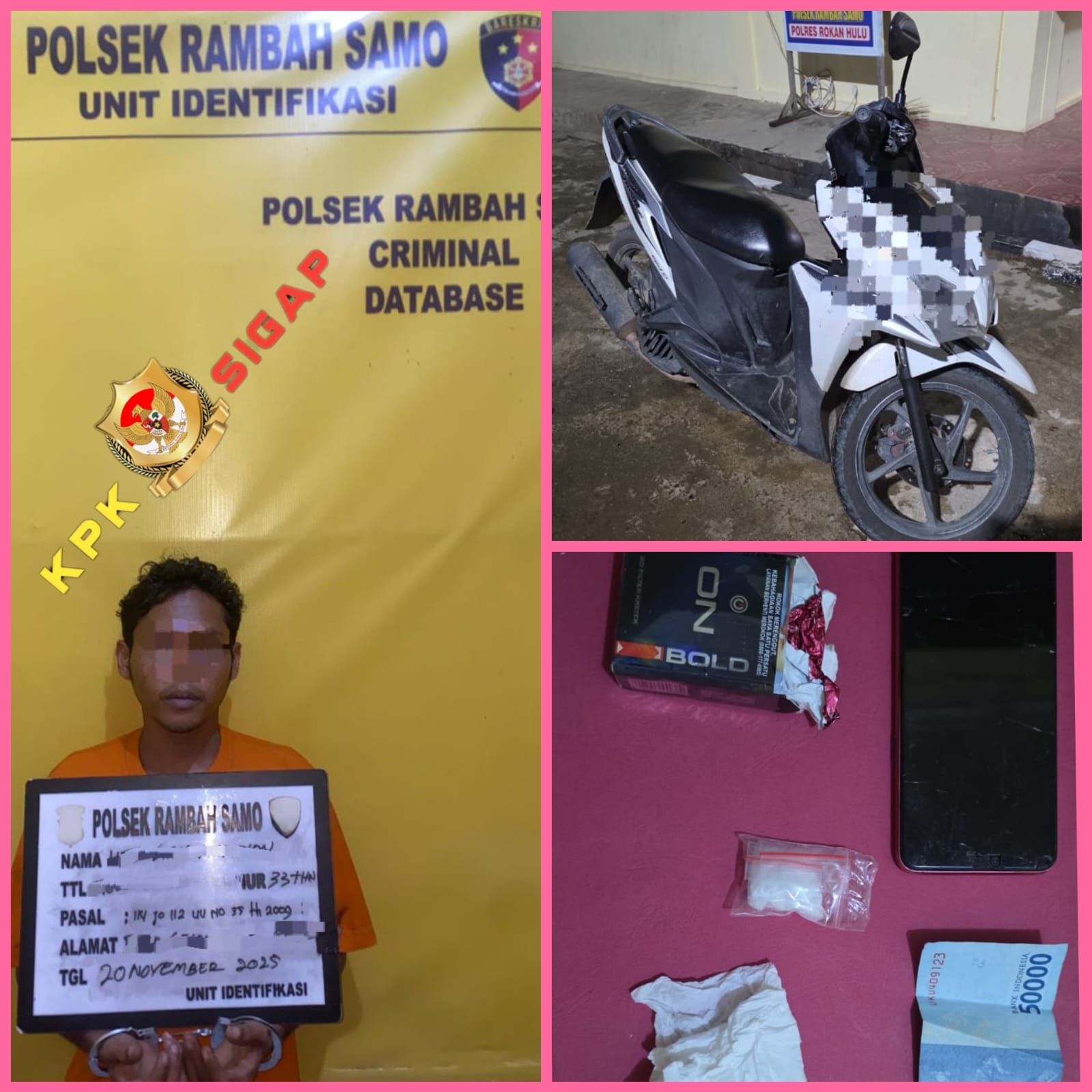 Upaya pemberantasan penyalahgunaan narkotika terus dilakukan jajaran Polres Rokan Hulu. Pada Kamis malam (20/11/2025) sekitar pukul 22.00 WIB, Polsek Rambah Samo berhasil mengamankan seorang pria terduga pelaku penyalahgunaan narkotika jenis sabu di wilayah Desa Rambah Samo Barat, Kecamatan Rambah Samo.