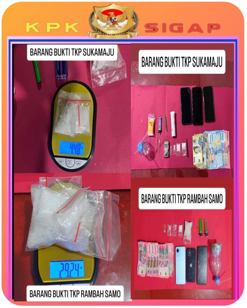 Dari lokasi tersebut, petugas menemukan barang bukti berupa sabu dengan berbagai ukuran, pil ekstasi, alat konsumsi, beberapa unit telepon genggam, serta uang tunai yang diduga berkaitan dengan aktivitas peredaran narkoba.