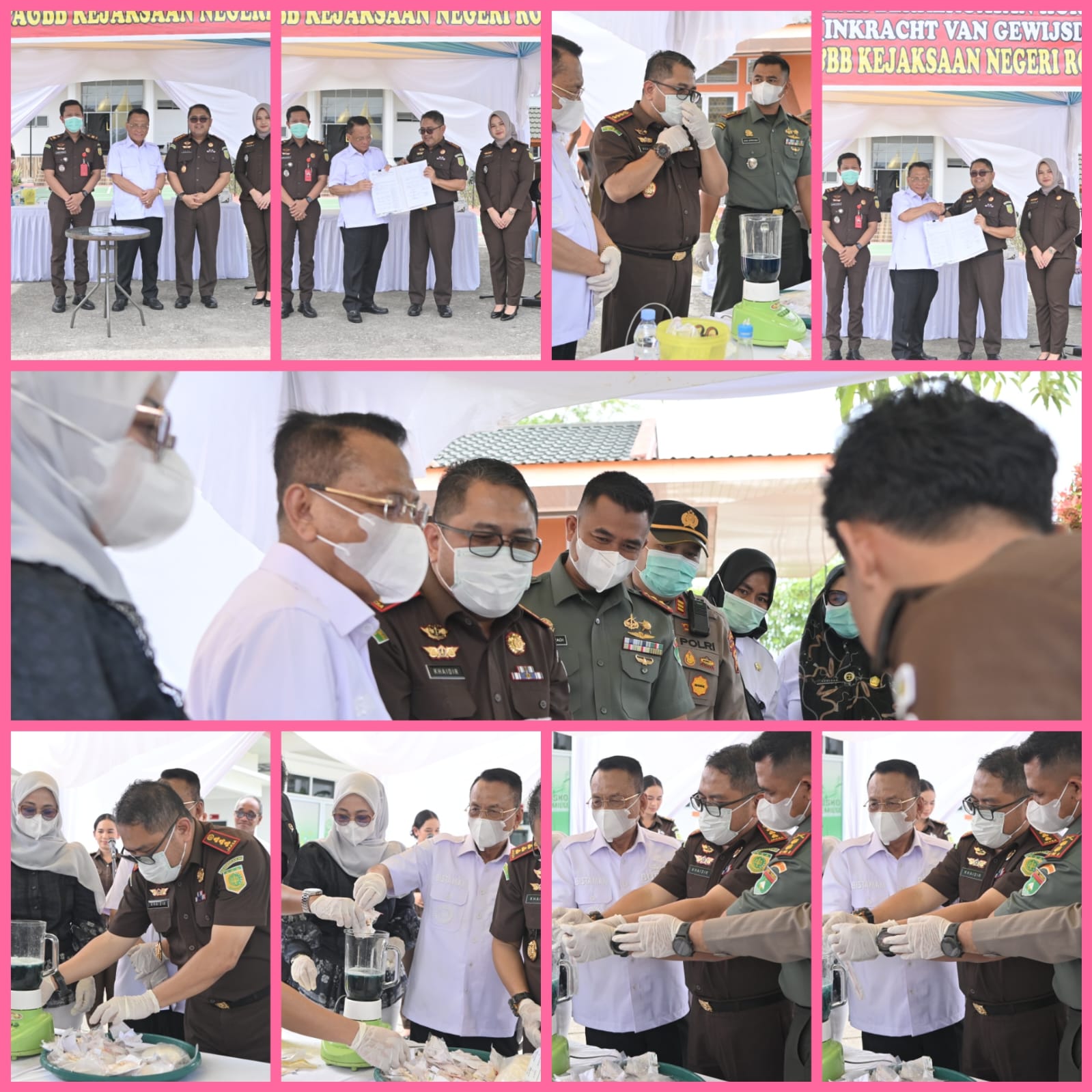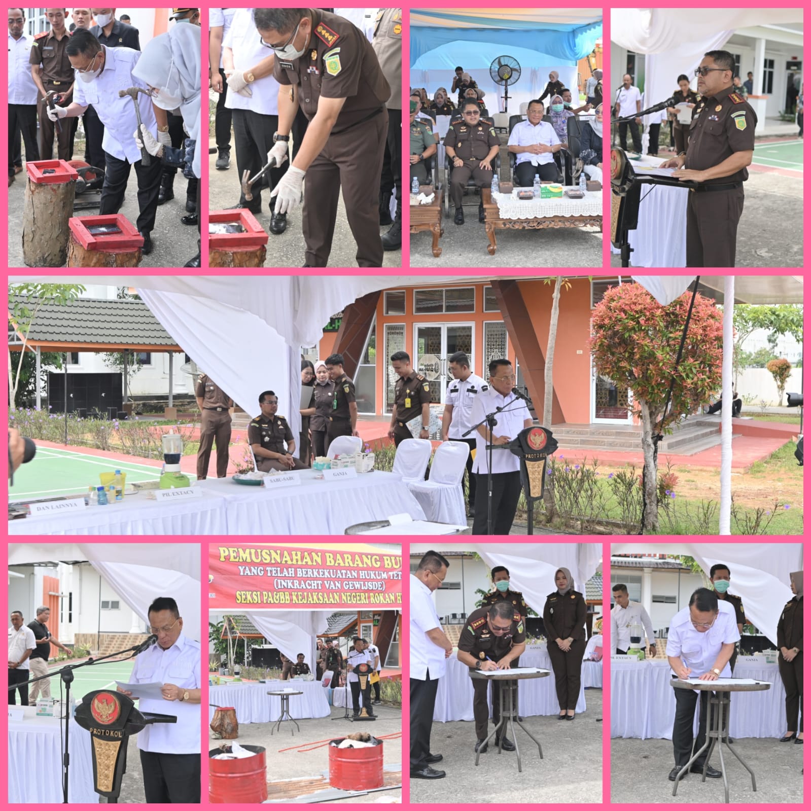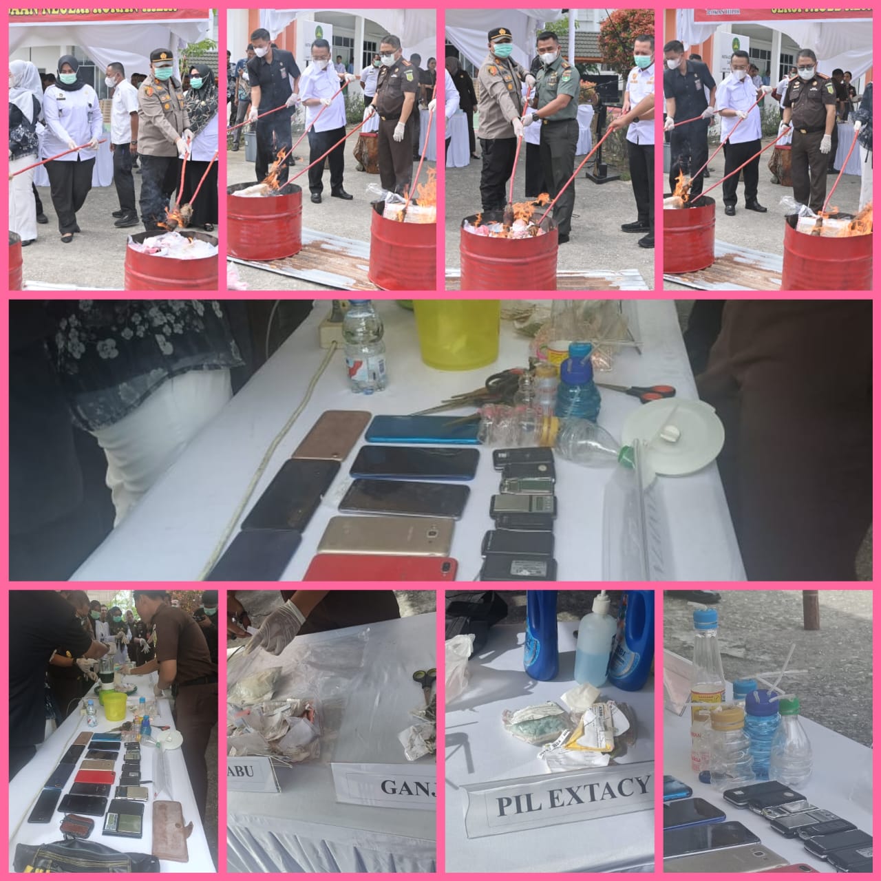 Di halaman belakang kantor Kejaksaan Negeri Rokan Hilir, aroma seng panas dan kayu terbakar perlahan memenuhi udara ketika sebuah drum besar yang di dalamnya tersusun pakaian bekas dan daun ganja mulai disulut api ditungku pembakaran. Di meja pemusnahan berjejer paket-paket narkotika berlabel dan deretan telepon genggam, botol-botol plastik yang telah dilubangi yang digunakan untuk pengisap sabu, hingga pil ekstasi berwarna-warni yang menanti giliran dihancurkan menggunakan blender yang dicampur dengan cairan pembersih berwarna biru.
