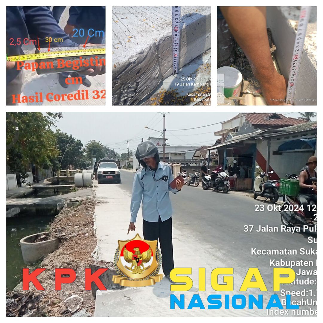 KpkSigap.com,Kabupaten Bekasi -Proyek pelebaran Jalan Raya Sukatani-Pulosirih, di Kecamatan Sukatani Kabupaten Bekasi, Jawa Barat, belum lama di kerjakan sudah banyak yang retak. Proyek yang diduga dengan anggaran miliaran rupiah tidak dikerjakan sesuai dengan spesifikasi teknis dan standar yang tercantum dalam Rencana Anggaran Biaya (RAB), Kamis (24/10/2024).