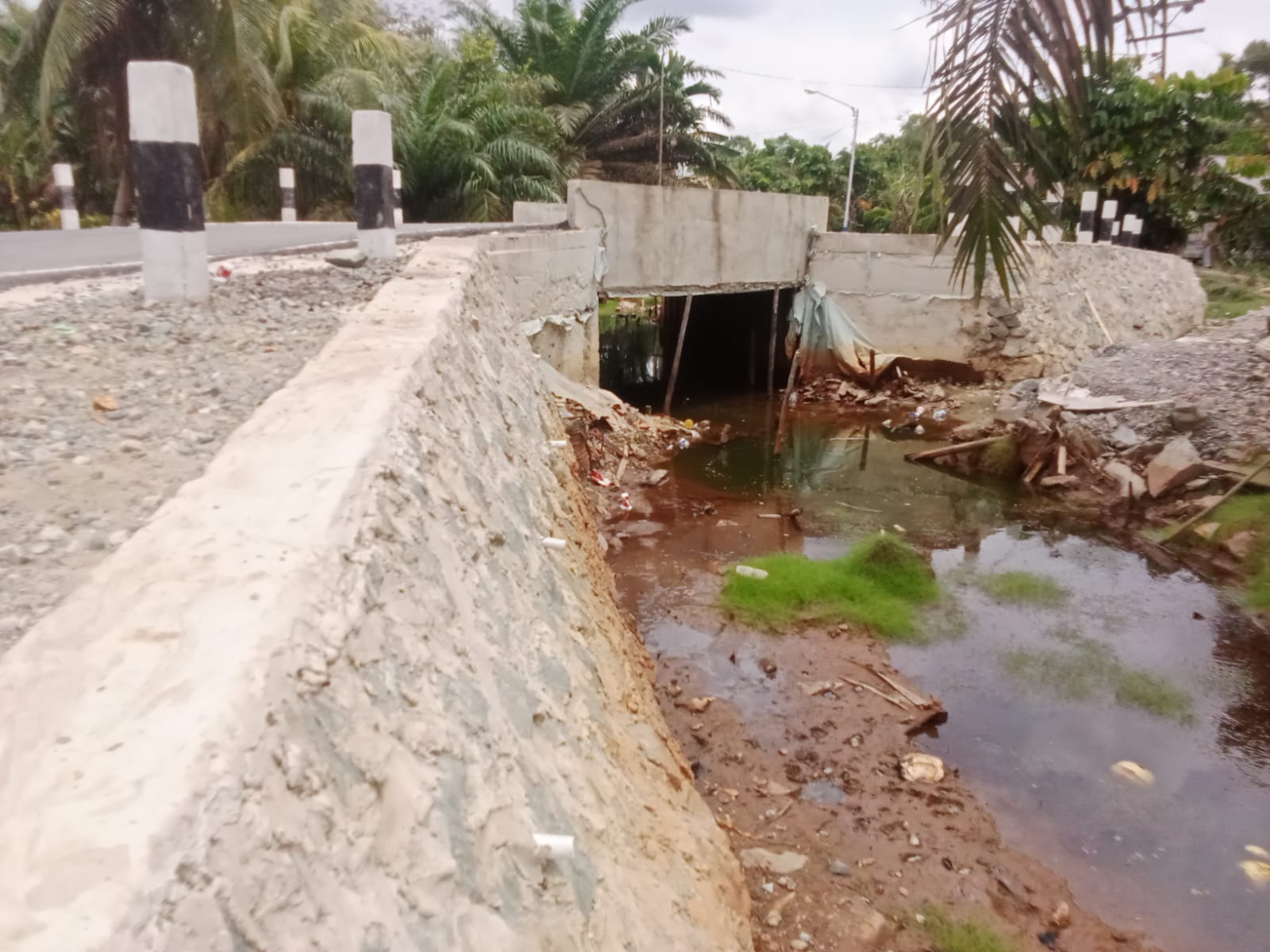 Salah satu kerusakan yang paling mencolok adalah patahnya dinding penahan tanah (retaining wall) pada bagian jembatan, yang semestinya menjadi struktur penting untuk menahan tekanan tanah dan mencegah longsor. Selain itu, tampak tidak adanya berem jalan, sebuah elemen dasar dalam konstruksi jalan untuk keamanan dan stabilitas.