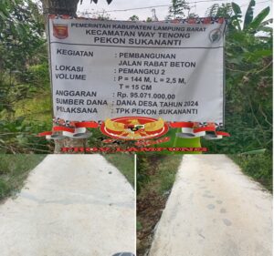 “Pasalnya proyek yang bersumber dari Anggaran Dana Desa (DD) Tahun 2024 dengan volume P 144 M X L 2.5 M X T 15 CM Jumlah Dana Rp.95.071.000.00 diduga bangunan jalan tersebut kurang berkualitas kuat dugaan adanya indikasi Penyelewengan oleh oknum PJ pratin di Pekon Sukananti Tersebut (29/08/2024).
