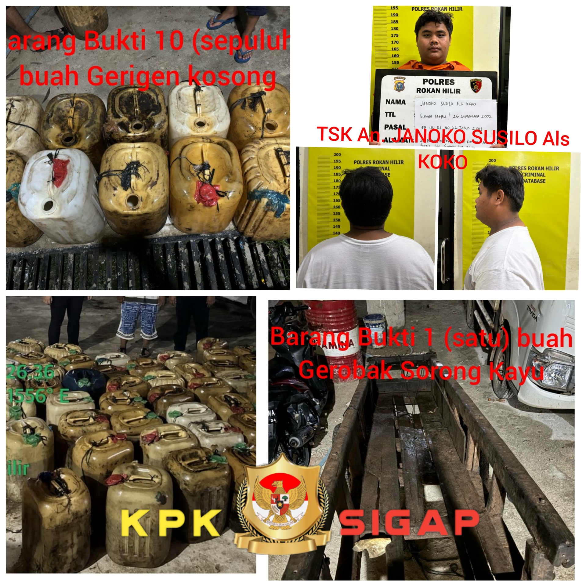 Diduga melakukan penimbunan BBM jenis solar bersubsidi, terbukti benar saja JS alias Koko yang di jumpai petugas di Jl. Beringin Jaya Kepenghuluan Sungai Bakau Kecamatan Sinaboi Kabupaten Rokan Hilir, didapati barang bukti ada 54 Buah Jerigen yang berisikan Bahan Bakar Minyak Bersubsidi jenis Bio Solar. 1 buah gerobak kayu dan 10 Buah Jerigen kosong.
