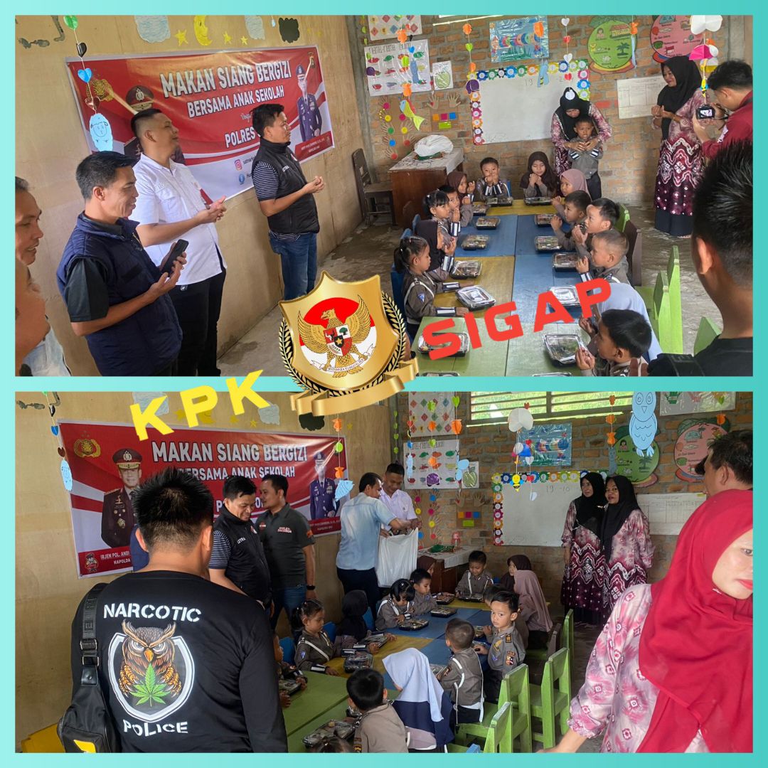 Permberian makanan siang bergizi gratis kepada Anak Anak TK Dharma Wanita 2 Desa Pusar dipimpin langsung oleh Kasat Narkoba Polres Oku Iptu Muhammad Andrian, S.Tr.K., S.I.K., M.Si., didampingi Kbo Sat Narkoba, Personel Sat Narkoba serta di temani oleh Kepala Sekolah TK Dharmawanita 2 dan para guru.