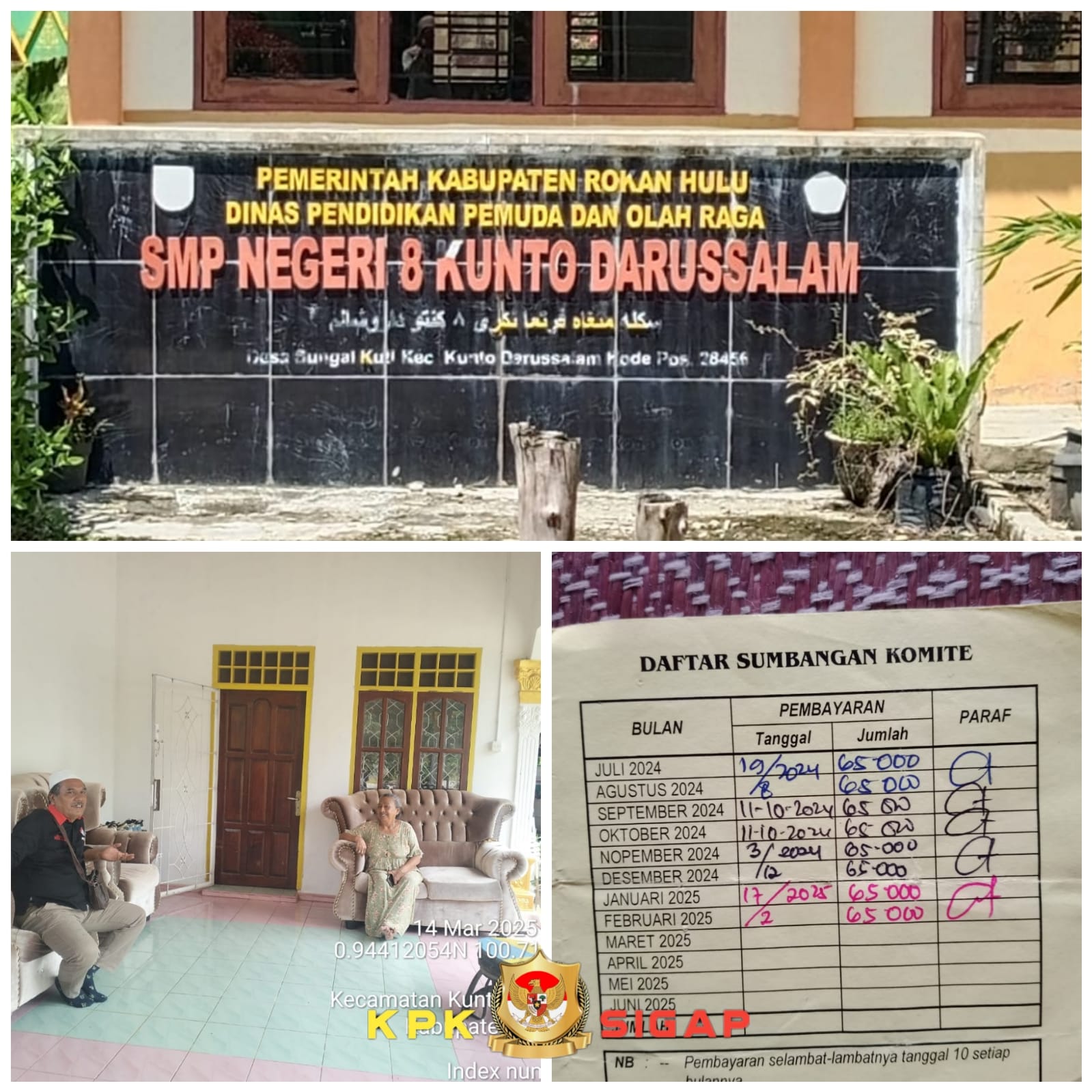 Dugaan pungutan liar (pungli) berbalut Sumbangan Komite Sekolah diduga dilakukan oleh SMP N 08 Kunto Darussalam, desa Sei Kuti, kecamatan Kunto Darussalam, kabupaten Rokan Hulu, diduga sudah sejak lama.