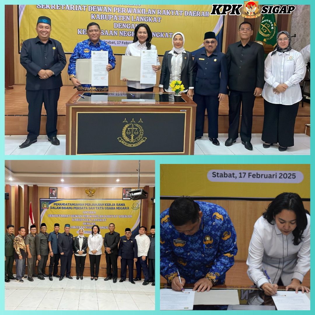 Langkat ( Sumut ) kpksigap.com Senin (17/2/2025) – Sekretariat DPRD Kabupaten Langkat bersama Kejaksaan Negeri (Kejari) Langkat menandatangani perjanjian kerja sama dalam penanganan masalah hukum di bidang Perdata dan Tata Usaha Negara (Datun). Penandatanganan kesepakatan ini dilakukan oleh Sekretaris DPRD Kabupaten Langkat, Drs. Basrah Pardomuan, dan Kepala Kejari Langkat, Yuliarni Appy, S.H., M.H. Acara tersebut turut disaksikan oleh Pimpinan DPRD Langkat dan Ketua-Ketua Fraksi DPRD Langkat di ruang aula kantor Kejari Langkat.