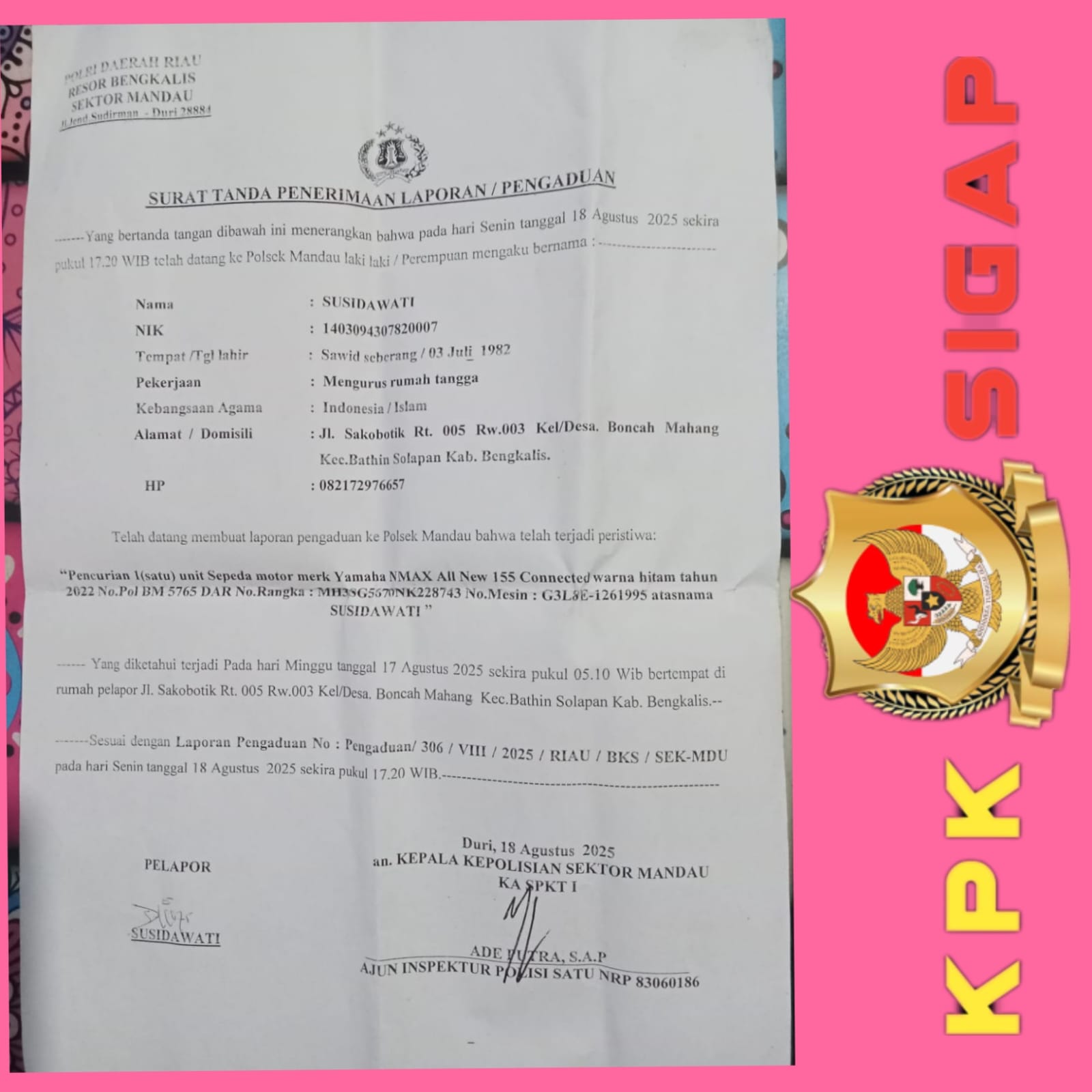 Kehilangan Sepeda Motor ibu Susidawati warga Jl.Sukobotil RT,005 RW,003 Desa Boncah Mahang Kecamatan Bathin Salopan Kabupaten Bengkalis dengan segala kerendahan hatinya meminta pelaku pencurian mengembalikan Sepeda Motornya yang telah hilang dalam keadaan utuh jika tidak mau mengembalikan jangan salahkan bila pelaku akan berhadapan dengan hukum.