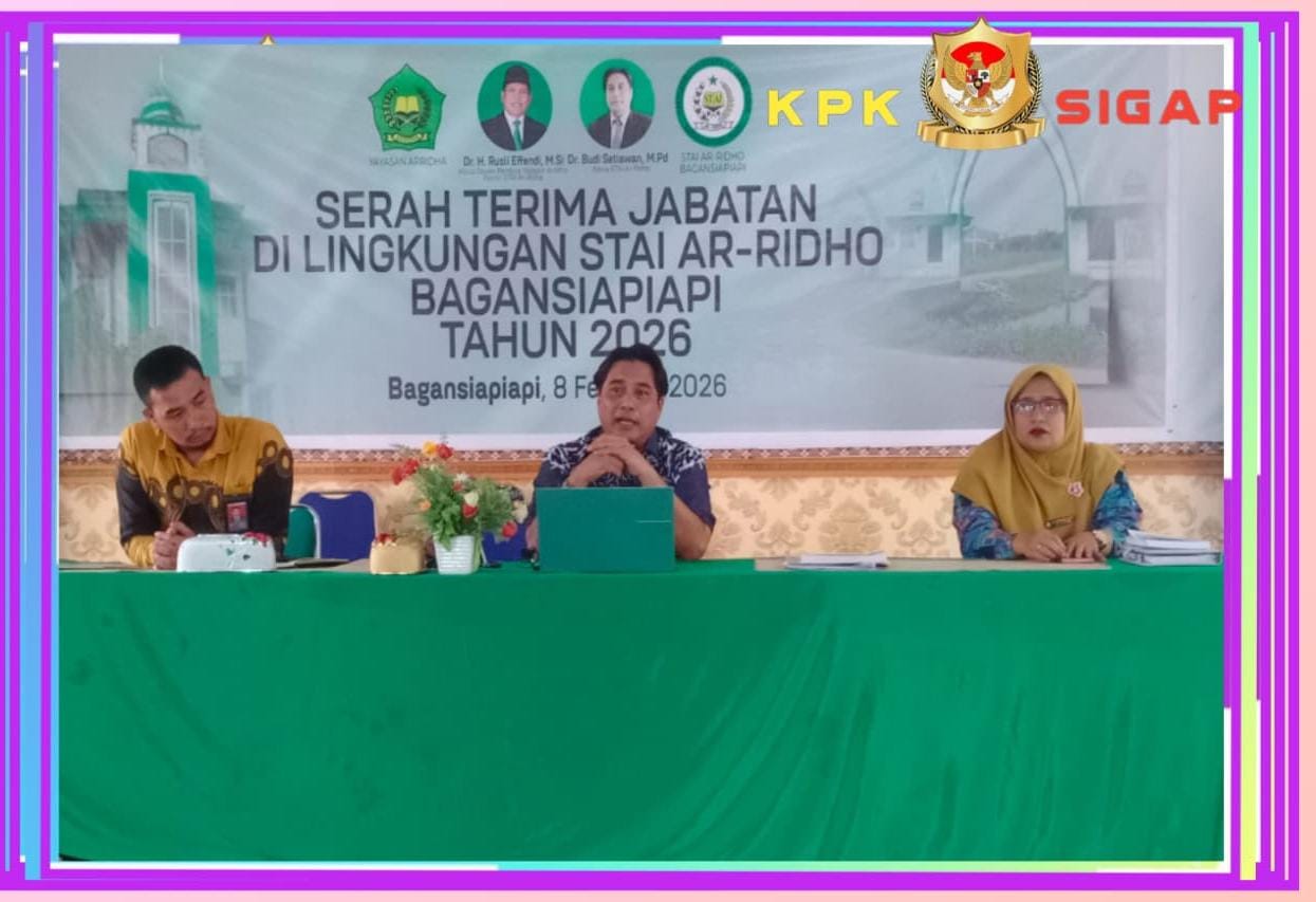 Sekolah Tinggi Agama Islam (STAI) Ar Ridho Bagansiapiapi melaksanakan upacara Serah Terima Jabatan (Sertijab) di lingkungan internal kampus Minggu (8/2/2026) di Gedung Rektorat, Jalan Kecamatan No. 9, Kepenghuluan Labuhan Tangga Besar Kecamatan Bangko Kabupaten Rokan Hilir (Rohil) Provinsi Riau.