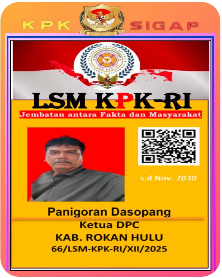 LSM KPK-RI nomor AHU 0003457.AHA. 0107. Tahun 2025, NIB 2306250120751 menerbitkan Surat Keputusan Nomor : 024 / SK/Lsmkpkri/IV/2026 untuk Legalitas Pengurus Kabupaten Rokan Hulu,. Provinsi Riau tertanggal 04 April 2026.